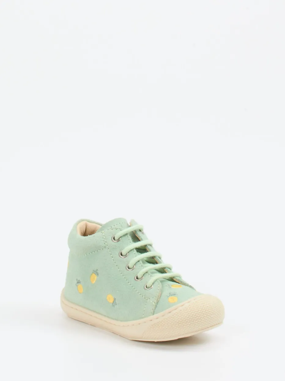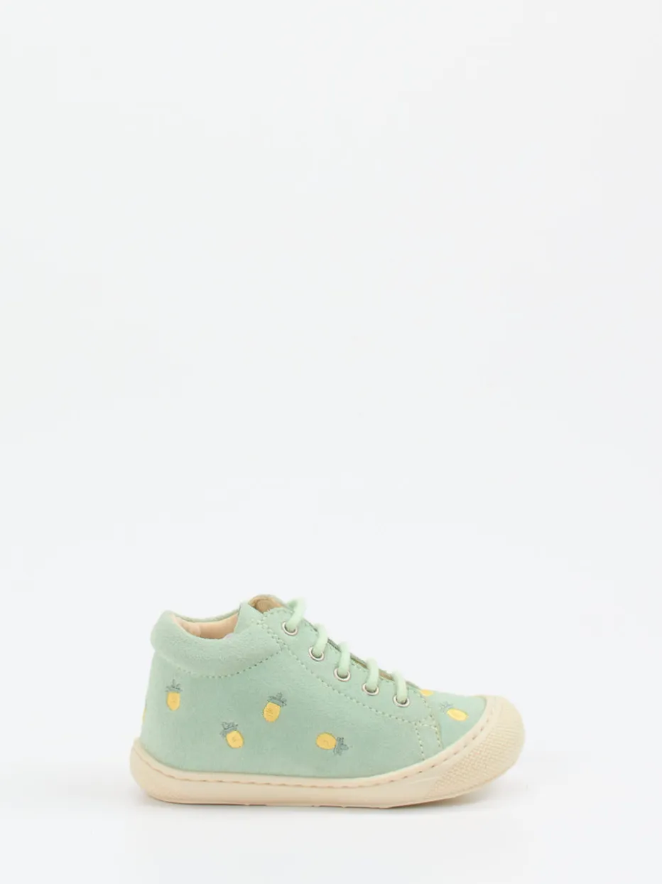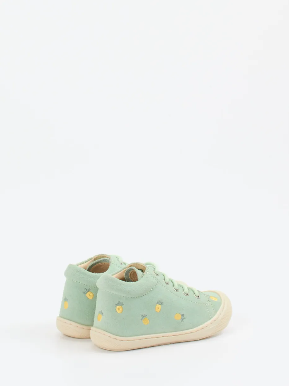 Ob bei den ersten Schritten im Garten oder entspannten Stunden zu Hause – das weiche Veloursleder, samtig angeschliffen, unterstützt zarte Füße zuverlässig. Der mintgrüne Farbton wird durch pastellgelbe und beige Akzente ergänzt, während gestickte Ananas-Motive auf der Sneakerform für gute Laune sorgen. Schnürung und verstärkte Zehenpartie geben sicheren Halt. Skandinavisch inspiriert und durch fröhliche Fruit Motifs absolut trendsicher, ergänzt das Modell sommerliche Outfits ideal.
