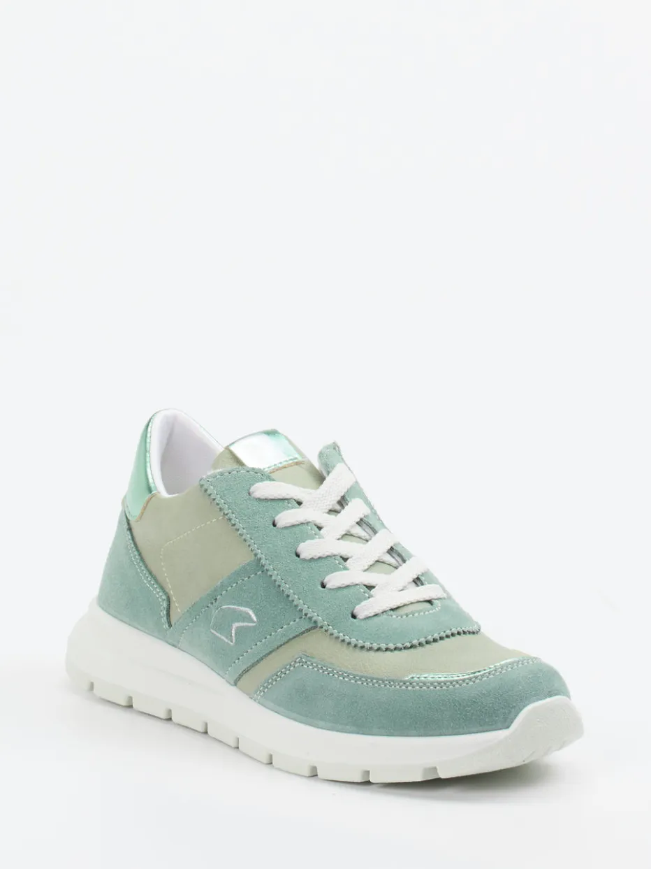 Trendfarbe trifft auf Komfort.Primigi präsentiert einen sportlich-schlichten Sneaker für Damen mit modischem Anspruch. Ideal für entspannte Stadttage oder den spontanen Ausflug: Das Modell kombiniert hochwertiges Veloursleder mit samtiger Oberfläche und textilen Partien. Salbeigrün dominiert als Trendfarbe und wird durch mintgrüne sowie weiße Akzente ergänzt. Die klassische, abgerundete Silhouette, dekorative Nähte und ein metallischer Fersenpatch setzen optische Highlights. Dank seitlichem Reißverschluss ist schnelles Anziehen garantiert; eine profilierte PU-Sohle sorgt für Trittsicherheit. Inspiriert von Streetwear und Minimalismus, greift der Look aktuelle Pastelltrends der Saison SS24 auf. Ein modisch-funktionaler Begleiter mit Primigi-Komfortanspruch.