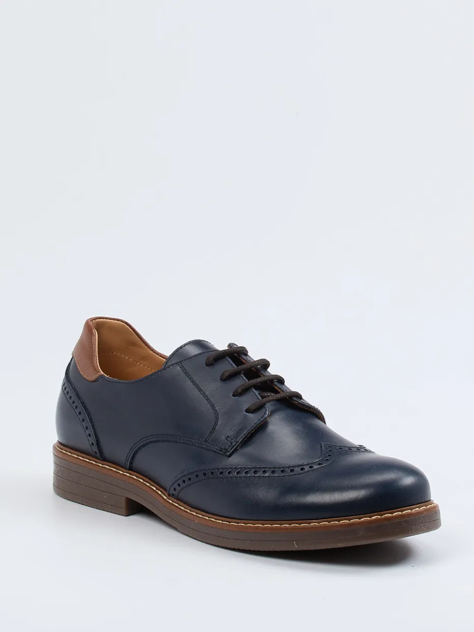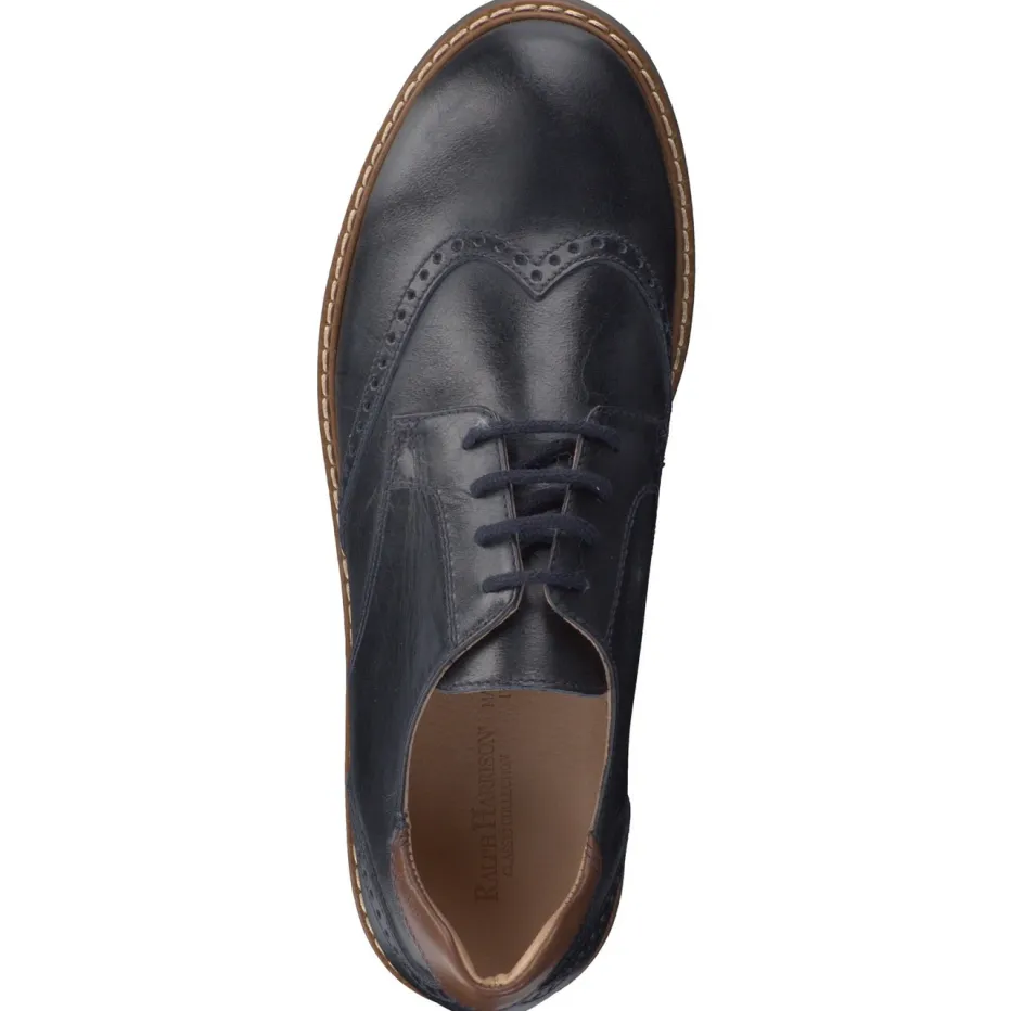 Harmonischer Klassiker für moderne Looks.Die Marke Ralph Harrison Classic präsentiert mit diesem Herren-Brogue einen stilbewussten Schnürschuh aus ihrer Kollektion. Ob im Business-Look oder an gepflegten Freizeittagen – das dunkelblaue Kalbleder mit matter Oberfläche und dezenter Brogue-Lochung verbindet Eleganz mit Alltagstauglichkeit. Die geschwungene Flügelkappe und die zweifarbige Fersenkappe setzen dezente Akzente. Der flache Schnitt, das weiche Lederfutter und das herausnehmbare Fußbett sorgen für angenehmen Tragekomfort. Die dunkelbraune Gummisohle mit Profil bietet sicheren Halt. Perfekt zu Chinos oder edlen Jeans kombinierbar. Ein Schuh mit klassischem Charakter und hoher Alltagseignung – typisch Ralph Harrison Classic.