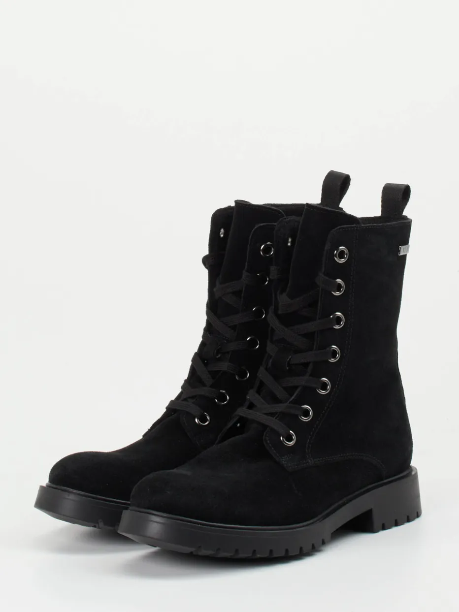 Funktionalität trifft urbanen Stil.Ralph Harrison Classic präsentiert wetterfeste Schnürboots für Damen. Für kühle, nasse Tage in der Stadt bieten diese schwarzen Boots aus samtig angeschliffenem Veloursleder zuverlässigen Schutz. Die matte Oberfläche, klassische Hochschaftform und das dezente Ton-in-Ton-Design mit Metallösen und Zuglasche sorgen für eine klar definierte Utility-Optik. Dank praktischer Kombination aus Schnürung und innenliegendem Reißverschluss gelingt das Anziehen bequem. Die rutschhemmende Profilgummisohle gewährleistet sicheren Halt – ob im Alltag oder auf herbstlichen Spazierwegen. Die Fleece-Innenfütterung schenkt dabei angenehme Wärme. Robustes Design mit alltagstauglichem Komfort – typisch Ralph Harrison.