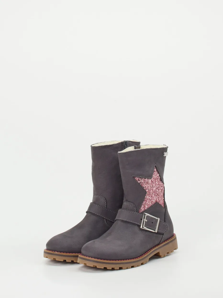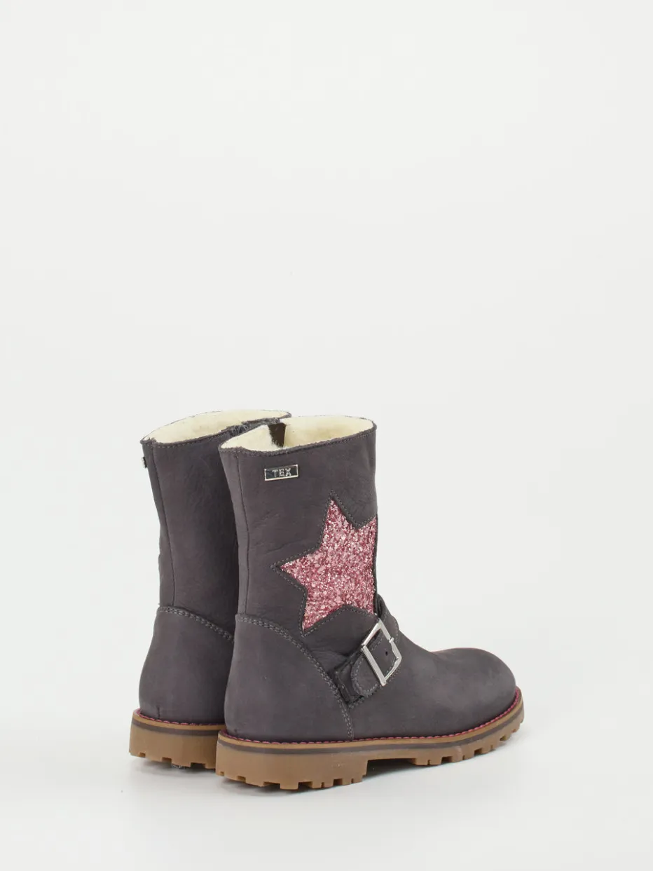 Wärmender Begleiter mit Glitzerdetail.Ralph Harrison Classic präsentiert Winterstiefel für Kinder mit femininem Star-Appeal. Wenn bei eisigen Temperaturen Trittsicherheit und Wohlfühlkomfort gefragt sind, liefert dieses Modell die passende Lösung. Gefertigt aus grauem Nubukleder zeigt es eine samtige Oberfläche und setzt durch den schimmernden Glitzerstern auf der Außenseite ein modisches Statement. Der messingfarbene Zier-Riemen mit silberfarbener Schnalle hebt sich ebenso stilvoll ab wie die rote Kontrastnaht an der rutschhemmenden Gummisohle. Innen umgibt den Fuß ein warmes Textilfutter in Naturwolle. Der seitliche Reißverschluss erleichtert das An- und Ausziehen spürbar. Ein trendiger Alltagsschuh für kühle Tage mit robustem Komfortversprechen.