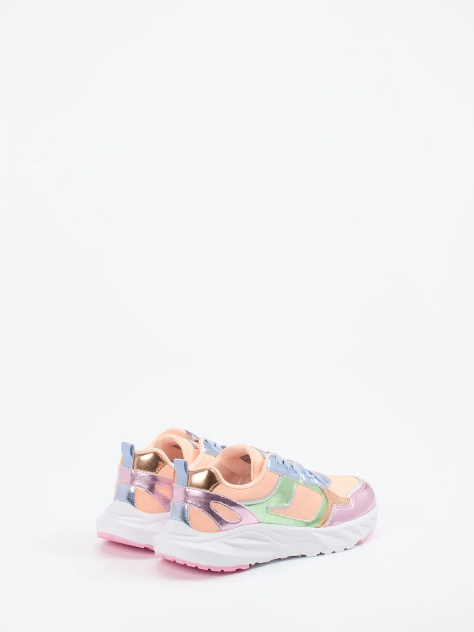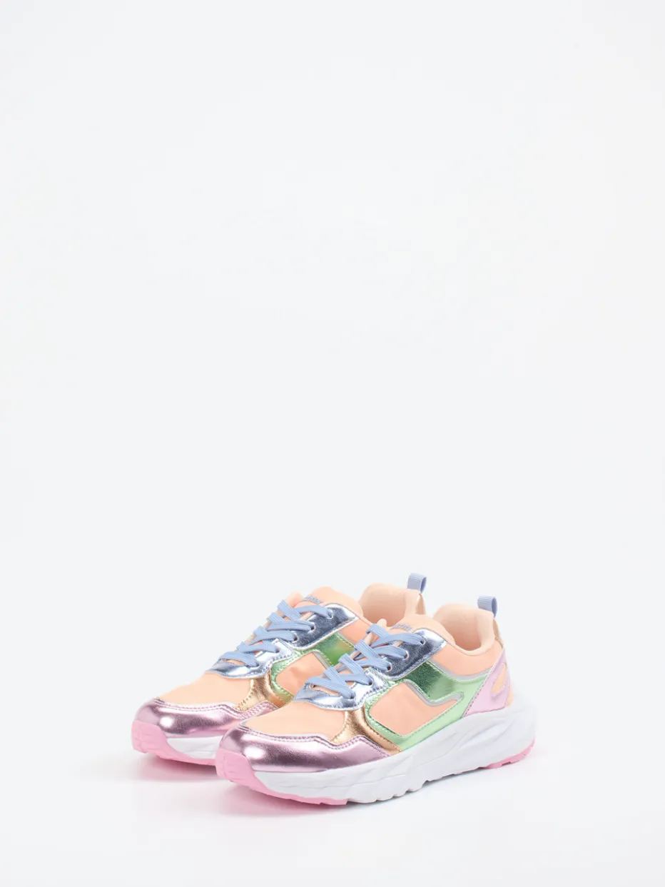 Ob beim Stadtbummel oder auf dem Schulhof – dieser Sneaker sorgt durch seine robuste Gummisohle und die auffällige Multicolor-Metallic-Optik garantiert für Aufsehen. Das glänzende Textilmaterial ist in Pfirsichrosa gehalten und wird von sanften Tönen wie Lavendel und Pastellblau ergänzt. Die chunky Silhouette greift den aktuellen Y2K- und Streetwear-Trend auf, während praktische Details wie die Zuglasche und verstärkte Fersenkappe Alltagstauglichkeit beweisen. Besonders harmonisch in Kombination mit einer leichten Kinderjacke in Pastellfarben.