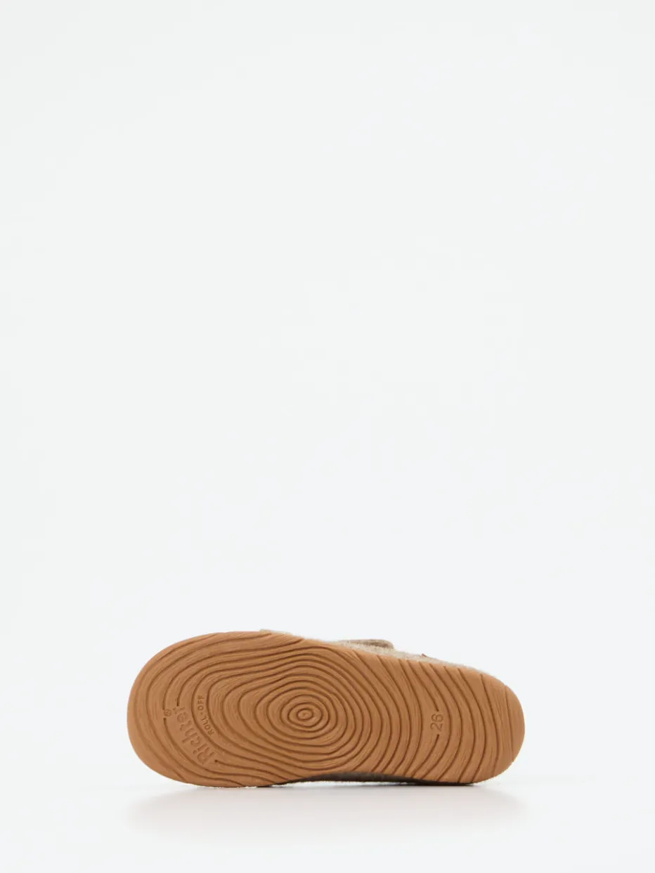 Wärme und Halt für kleine Entdecker.Der Richter Kinderhausschuh überzeugt als gemütlicher Begleiter für Zuhause und Kindergarten. Ob beim Spielen auf glatten Böden oder beim Toben im Kinderzimmer – dieser Hausschuh erfüllt kindliche Bedürfnisse mit seiner flexiblen Gummisohle und dem praktischen Klettverschluss. Gefertigt aus robustem Filz mit melierter Wolloberfläche in natürlichem Beigebraun, bietet er nicht nur atmungsaktive Wärme, sondern auch liebevolle Details wie eine Bären-Applikation. Die klassische runde Form und das skandinavisch inspirierte Design passen perfekt in moderne Kinderkleidung. Ideal zu kombinieren mit Wollsocken oder einem Pyjama aus Baumwolle. Nachhaltiger Komfort trifft auf spielerische Leichtigkeit – typisch Richter.