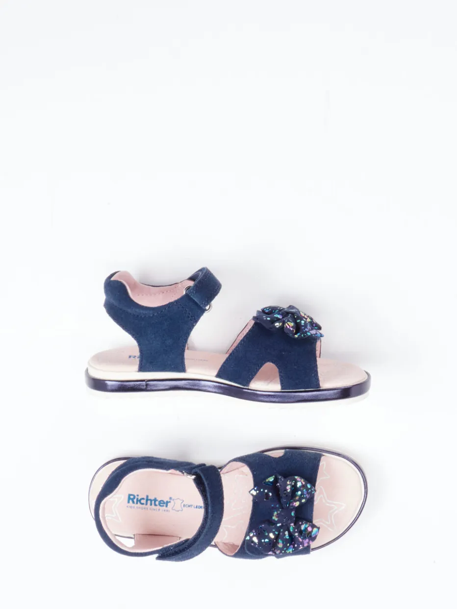 Verspielter Sommerliebling mit Alltagstauglichkeit.Die Marke Richter präsentiert eine Kinder-Klettsandale in femininem Dunkelblau. Ideal für warme Tage im Alltag oder den Strandurlaub bietet die Sandale bequemen Halt durch den verstellbaren Klettverschluss und eine rutschfeste Gummisohle. Gefertigt aus samtig angeschliffenem Veloursleder und ergänzt durch roséfarbenes Innenfutter, verleiht eine glitzernde Schleifenapplikation einen verspielten Akzent. Die offene, ergonomische Form und weiche Verarbeitung sorgen für Tragekomfort sowie sicheren Sitz beim Spielen und Rennen. Ein klarer Trendverweis sind die funkelnden Dekors und Pastellkontraste. Ein funktionaler Lieblingsschuh mit modischem Feinsinn für sommerfreudige Mädchen.