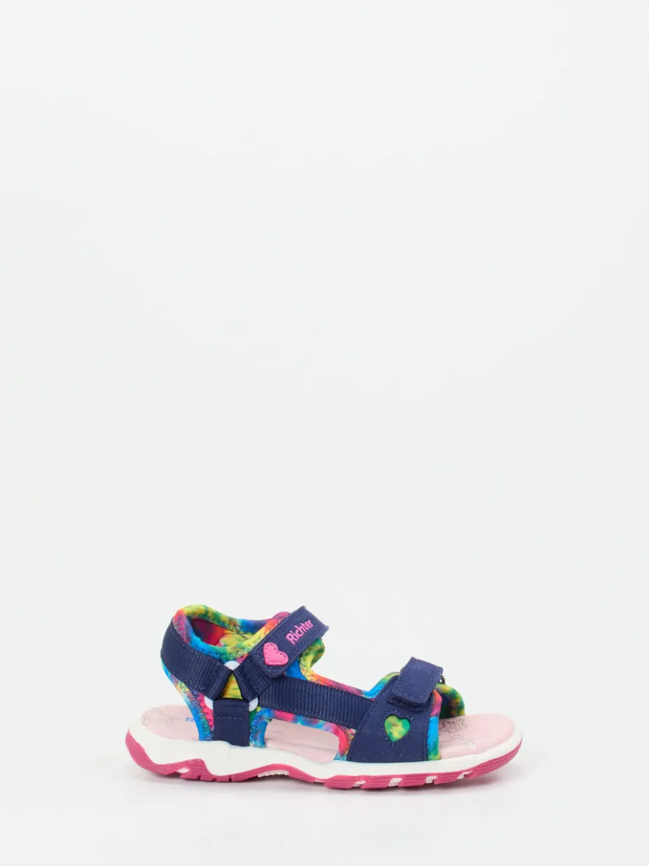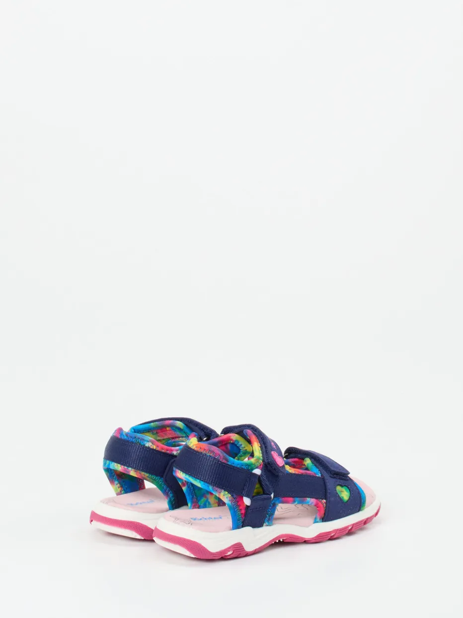 Ob für Ausflüge im Sommer oder spielerische Abenteuer im Alltag: Das Textilmaterial mit matt strukturierter Oberfläche wird von einem weichen Neopren-Innenfutter begleitet, das gepolsterten Halt bietet. Das dominante Dunkelblau wird durch leuchtendes Pink und Türkis in einem Multicolor-Muster aufgefrischt, ergänzt von Herz-Applikationen und kontrastierenden Nähten. Zwei Klettverschlüsse und eine flexible Gummisohle mit griffigem Outdoor-Profil bieten sicheren Halt auf wechselndem Untergrund. Das Design orientiert sich an farbenfroher Kinderfreizeitmode und funktionaler Kidswear.