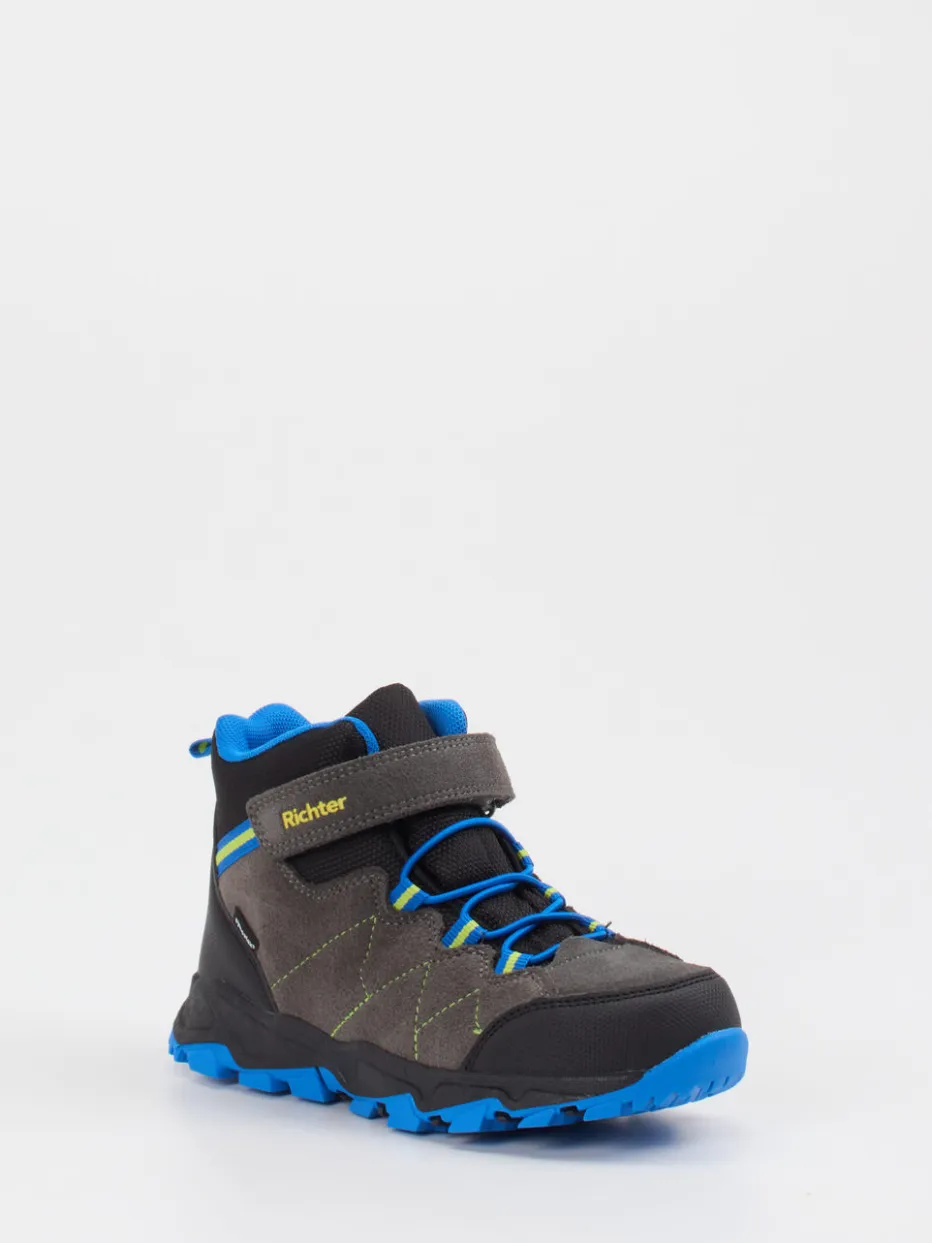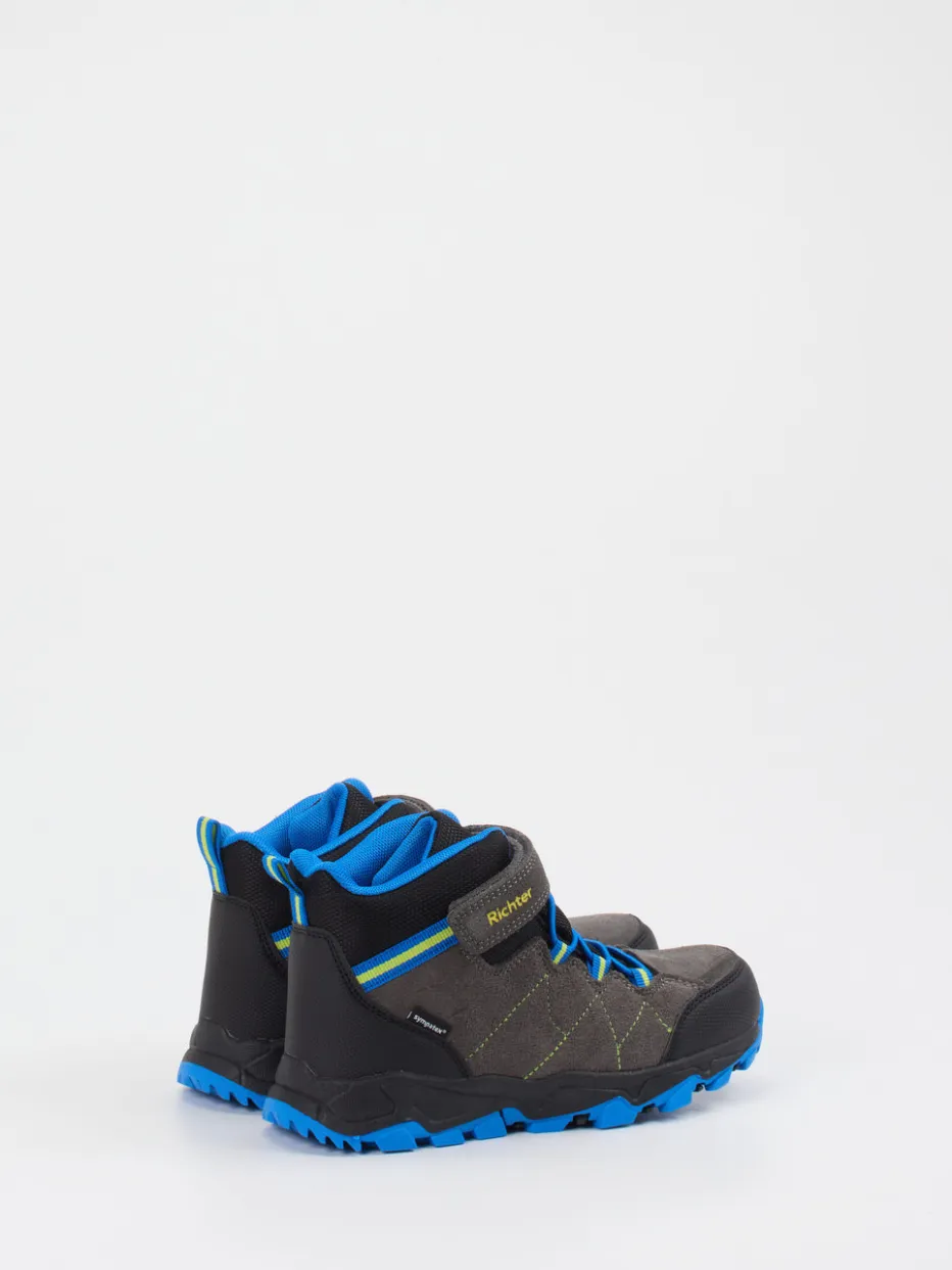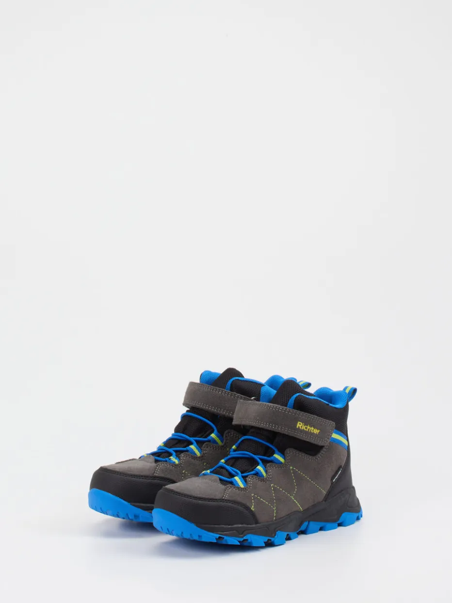 Für kleine Entdecker bei jedem Wetter.Richter präsentiert robuste Wanderschuhe für Kinder mit cleverer Funktionalität. Ideal für aktive Tage im Gelände: Der knöchelhohe Outdoor-Schuh kombiniert graues Veloursleder mit samtiger Struktur, atmungsaktiven Mesh-Einsätzen und reflektierenden Neonakzenten. Klettverschluss und Elastik-Schnürung erleichtern das Anziehen, während die wasserdichte Sympatex-Membran Schutz bei Nässe bietet. Dank robuster Gummisohle mit markantem Stollenprofil ist zuverlässiger Halt auf unebenem Terrain gegeben. Ein funktionaler Stil mit Streetwear-Note – perfekt kombinierbar zu Outdoorjacken und wetterfester Kleidung. Zuverlässige Begleiter-Qualität in sportlichem Design – wie gemacht für Abenteuer im Freien.