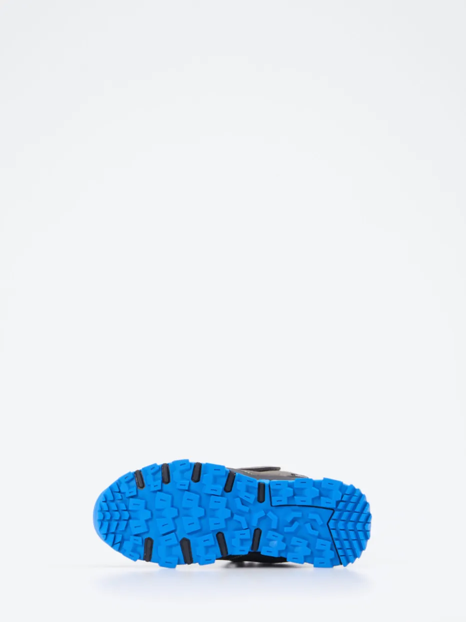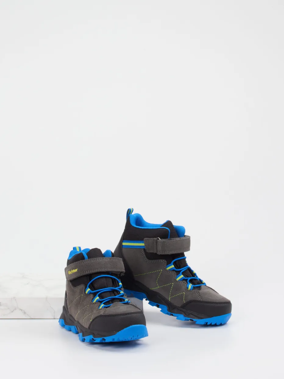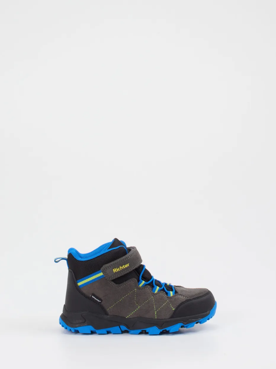 Für kleine Entdecker bei jedem Wetter.Richter präsentiert robuste Wanderschuhe für Kinder mit cleverer Funktionalität. Ideal für aktive Tage im Gelände: Der knöchelhohe Outdoor-Schuh kombiniert graues Veloursleder mit samtiger Struktur, atmungsaktiven Mesh-Einsätzen und reflektierenden Neonakzenten. Klettverschluss und Elastik-Schnürung erleichtern das Anziehen, während die wasserdichte Sympatex-Membran Schutz bei Nässe bietet. Dank robuster Gummisohle mit markantem Stollenprofil ist zuverlässiger Halt auf unebenem Terrain gegeben. Ein funktionaler Stil mit Streetwear-Note – perfekt kombinierbar zu Outdoorjacken und wetterfester Kleidung. Zuverlässige Begleiter-Qualität in sportlichem Design – wie gemacht für Abenteuer im Freien.