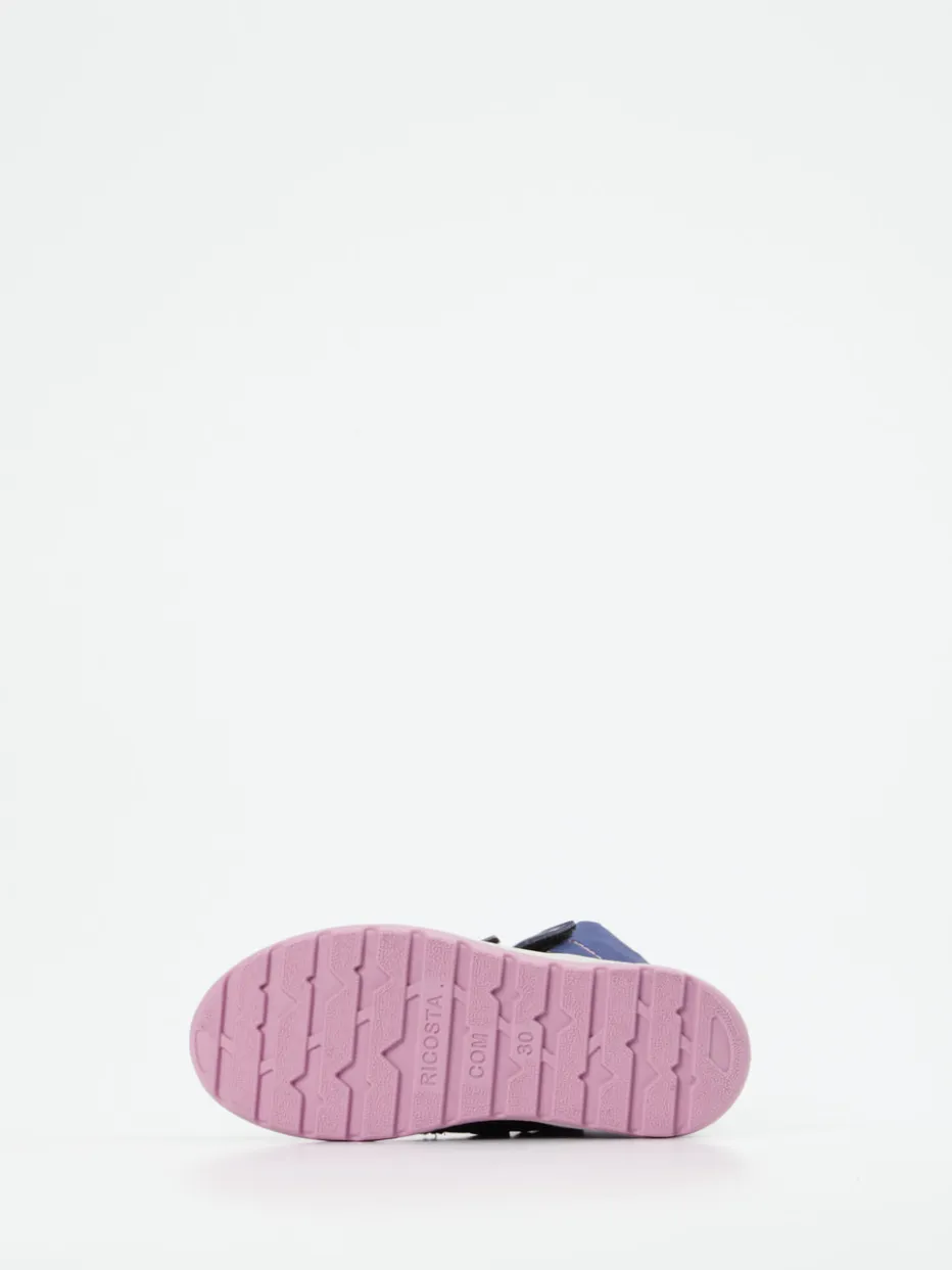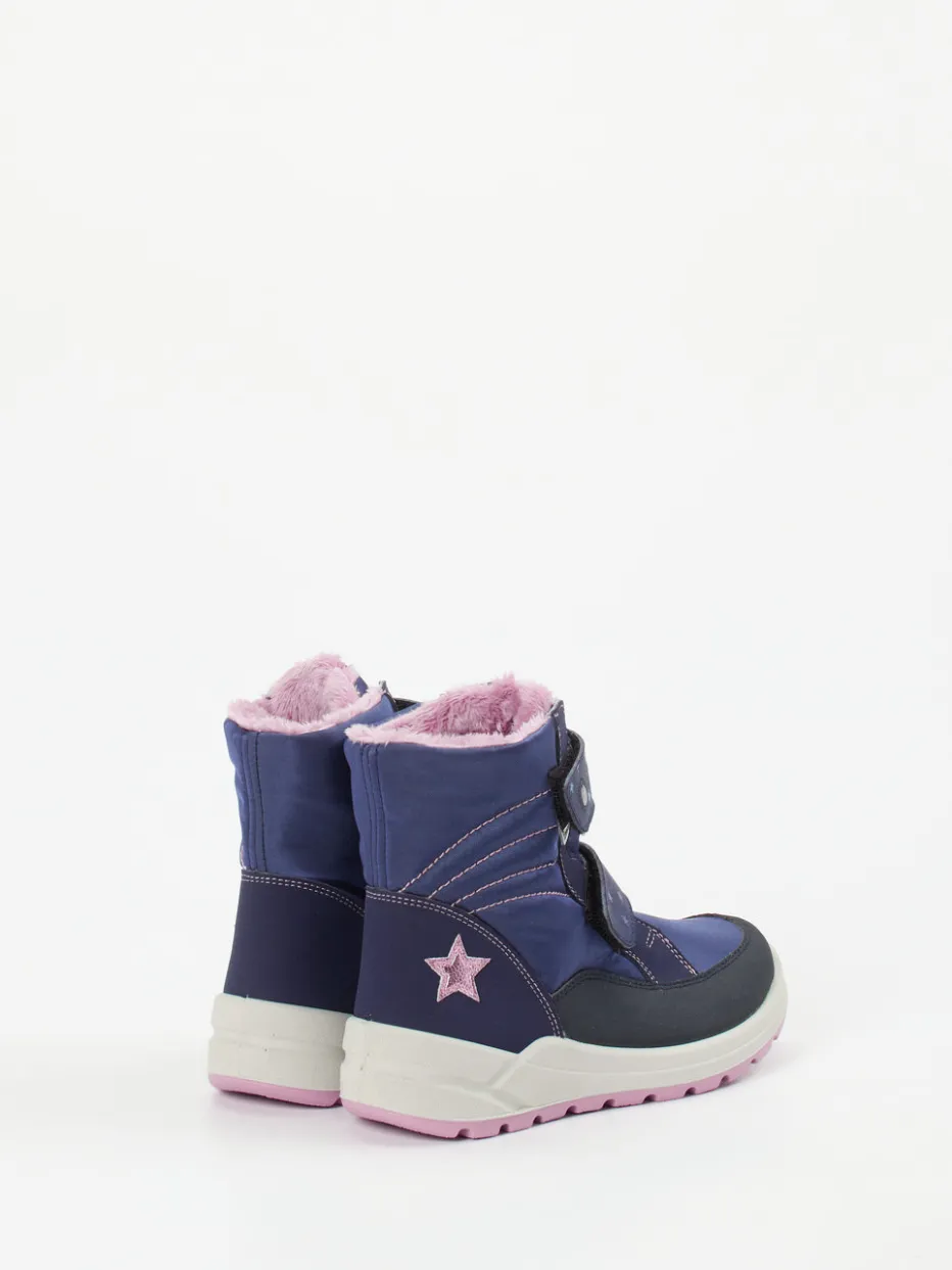 Wärmend und alltagstauglich.Ricosta präsentiert robuste Kinderklettboots für die kalte Jahreszeit. An kühlen Tagen im Herbst und Winter bieten diese hochgeschlossenen Winterboots zuverlässige Wärme und Trittsicherheit. Das synthetische Obermaterial zeigt sich in mattem Dunkelblau mit glitzernden Klettverschlüssen und hellrosa Kontrastnähten. Ein rosa Innenfutter aus warmer Textilfaser, pastellfarbene Sternapplikationen sowie eine rutschfeste PU-Profilsohle unterstreichen die durchdachte Umsetzung für aktive Alltagseinsätze. Inspiriert von kindgerechtem Streetwear-Stil, passen sie ideal zu Thermo-Leggings oder gefütterter Winterjacke. Ein funktionaler Begleiter mit spielerischem Charme – typisch Ricosta.