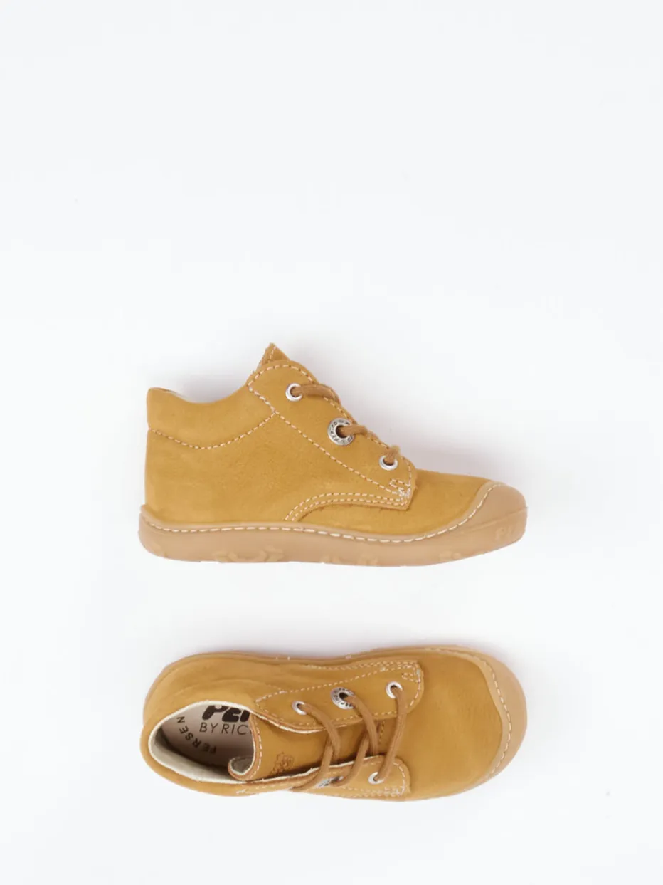 Sicher unterwegs, ganz entspannt.Ricosta präsentiert mit diesem honigbraunen Lauflerner der Linie Pepino einen durchdachten Kinderschuh in mittlerer Weite. Für kleine Entdecker im Alltag bietet das Modell weiches, samtig angeschliffenes Nubukleder, ein helles Lederfutter sowie eine komfortabel gepolsterte Innensohle. Der knöchelhohe Schnitt mit gepolstertem Einstieg schützt sanft und gibt Halt, während die flexible Naturgummisohle mit Krabbelschutz sich jeder Bewegung anpasst. Kontrastnähte, ein geprägtes Logo und eine stabile Schnürung mit Metallösen unterstreichen den charmant-skandinavischen Minimalismus des Designs. Gut kombinierbar mit Strick und Erdtönen. Ideal abgestimmt auf die Bedürfnisse kleiner Füße – mit Liebe zum Detail von Ricosta.