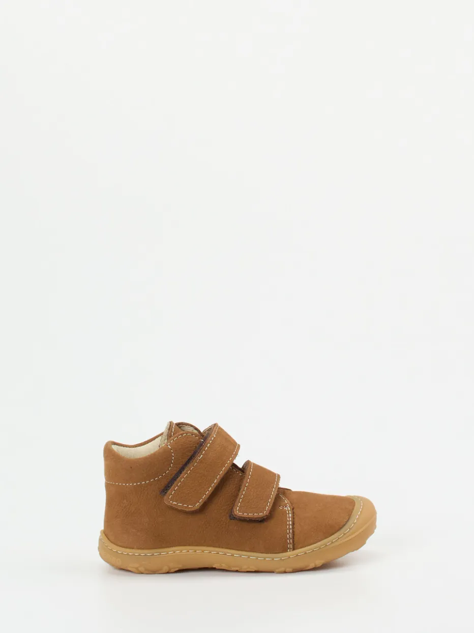 Natürlich und beweglich durch den Alltag.Ricosta zeigt mit diesem Lauflernschuh eine komfortable Wahl für kleine Füße in der Entdeckungsphase. Der cognacbraune Schuh ist aus hochwertigem Nubukleder gefertigt, samtig angeschliffen und mit hellen Steppnähten akzentuiert. Dank doppeltem Klettverschluss lässt sich die Weite flexibel einstellen, während das softe Lederfutter mit gepolstertem Rand für Komfort sorgt. Die profilierte Gummisohle ist besonders biegsam und bietet sicheren Halt – auch beim Spielen. Die knöchelhohe Silhouette unterstützt zusätzlich. Optimal kombinierbar mit Leggings oder Outdoorjacken in Naturtönen. Ideal für freiheitsliebende Kinderfüße mit Stil – von Pepino by Ricosta.