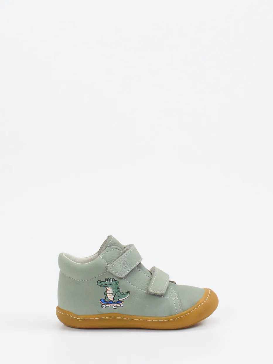 Für kleine Entdecker gemacht.Ricosta Lauflernschuhe begleiten Kinder zuverlässig bei ersten Abenteuern im Alltag. Das salbeigrüne Nubukleder ist samtig angeschliffen und wirkt durch die matte Oberfläche besonders natürlich. Zwei Klettverschlüsse sorgen für einfaches An- und Ausziehen, während die weiche Polsterung sowie das hellgraue Lederfutter den Tragekomfort erhöhen. Der verstärkte Fersenbereich und die honigfarbene, flexible Gummisohle bieten Stabilität und Schutz für empfindliche Füße. Die Stickerei eines Skateboard fahrenden Krokodils verleiht dem Modell eine charmante Note. Ideal für Freizeitoutfits mit pastellfarbenen Akzenten. Hochwertige Verarbeitung für Kinderfüße mit Anspruch – Ricosta Komfort für die Kleinsten.