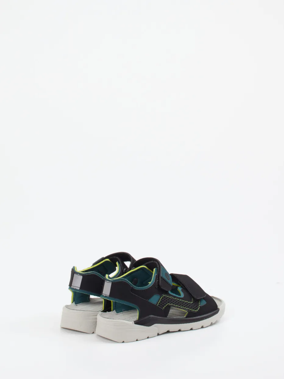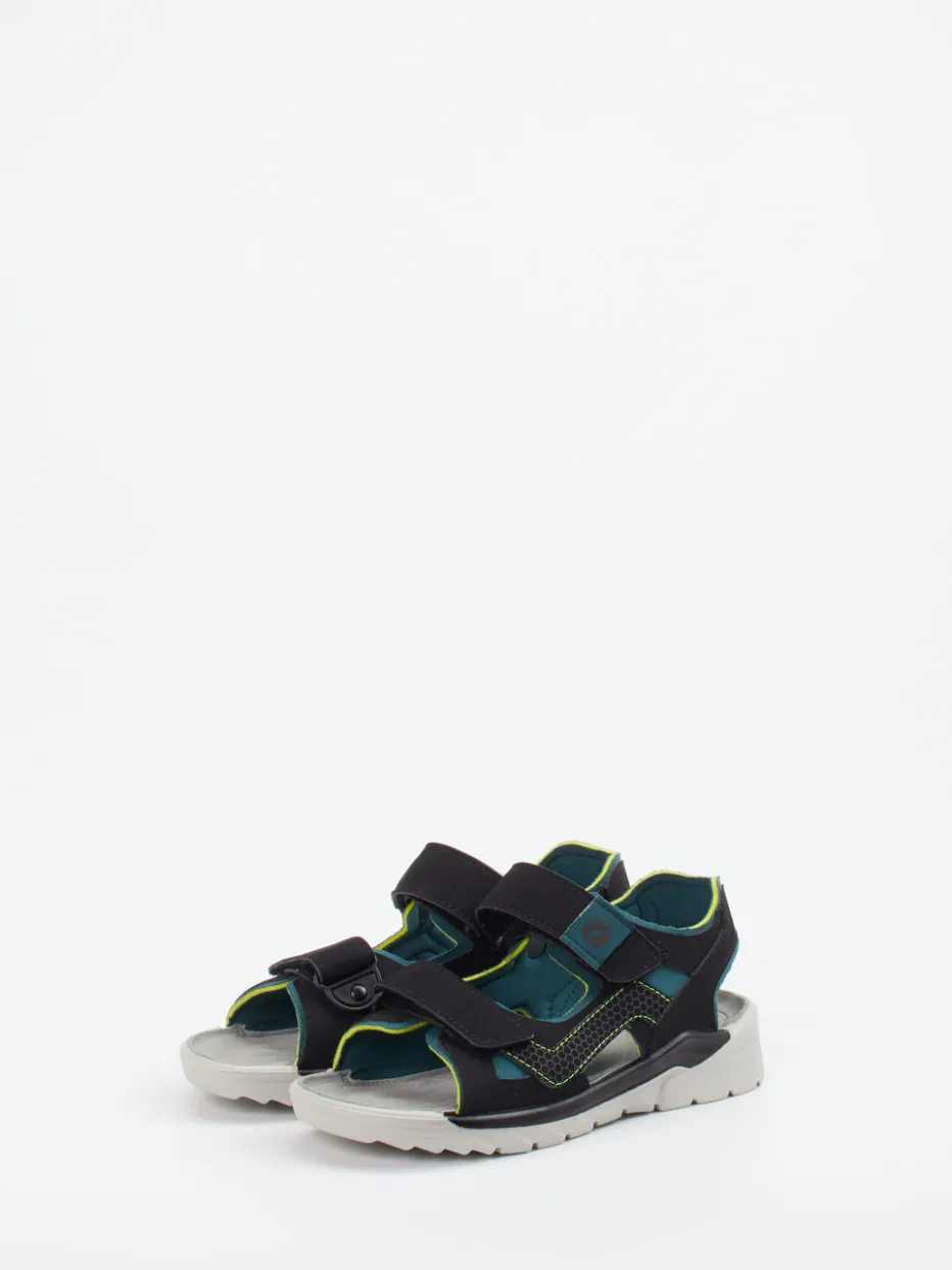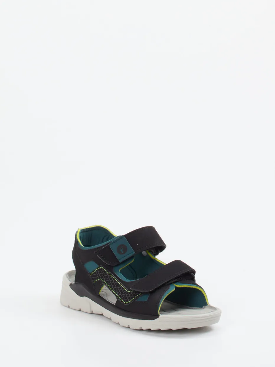 Für Sommerabenteuer gemacht.Ricosta zeigt mit dieser Outdoor-Sandale für Kinder eine clevere Verbindung aus Komfort und Alltagstauglichkeit. Auf dem Weg zur Strandbucht oder auf dem Spielplatz sorgt die rutschfeste PU-Profilsohle für standfesten Halt. Das robuste Synthetikmaterial wird durch eine matte Oberfläche und markante neonfarbene Ziernähte aufgewertet. Dank des gepolsterten Fersenbands und der doppelten Klettverschlüsse sitzt die offene Silhouette zuverlässig und bequem. Schwarz mit Applikationen in Petrol- und Hellgrau wirkt dynamisch und vielseitig kombinierbar. Reflektierende Details an der Ferse erhöhen die Sichtbarkeit – ein Extra an Sicherheit. Funktionalität und modernes Design – kindgerecht interpretiert von Ricosta.
