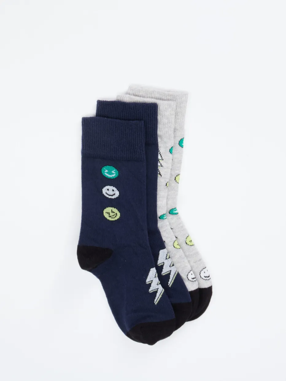 Mit ihren fröhlichen Smiley- und Blitz-Motiven auf dunkelblauem, grauem und schwarzem Grund greifen sie den Y2K-Trend gekonnt auf. Gefertigt aus einem weichen Baumwollmix mit glatter Oberfläche überzeugen sie durch ein angenehmes Tragegefühl – unterstützt durch elastische Bündchen sowie verstärkte Ferse und Spitze. Das klassische Rippdesign sorgt für gute Passform und macht sie ideal für Schule, Spielplatz oder Zuhause. Stilistisch passen sie perfekt zu lockeren Sneakern und angesagtem Kinder-Streetwear-Look.