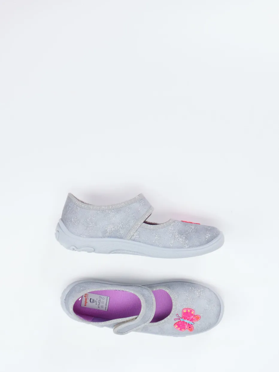 Mädchenhaft glitzernd für entspannte Stunden.Superfit zeigt mit diesem Kinder-Hausschuh im Ballerina-Stil ein Modell, das Komfort und Stil ideal verbindet. Der Schuh ist aus Textil gefertigt und verfügt über eine silbergraue Glitzeroberfläche, ergänzt um eine dekorative Schmetterlingsstickerei. Die runde, geschlossene Form und der praktische Klettverschluss erleichtern das Anziehen und sorgen für sicheren Halt. Eine flexible PU-Sohle mit Butterfly-Prägung bietet Trittsicherheit – perfekt für Abenteuer auf dem Kinderzimmerboden. Das Design orientiert sich an aktuellen Glitzertrends (SS24) und spricht komfortaffine Mädchen an. Superfit steht für durchdachten Tragekomfort bei kindgerechter Ästhetik.