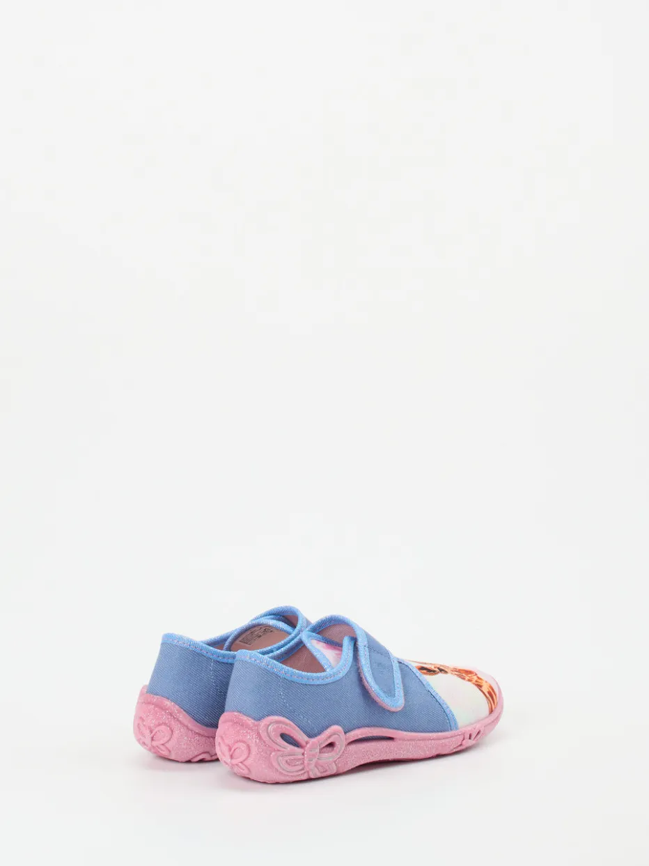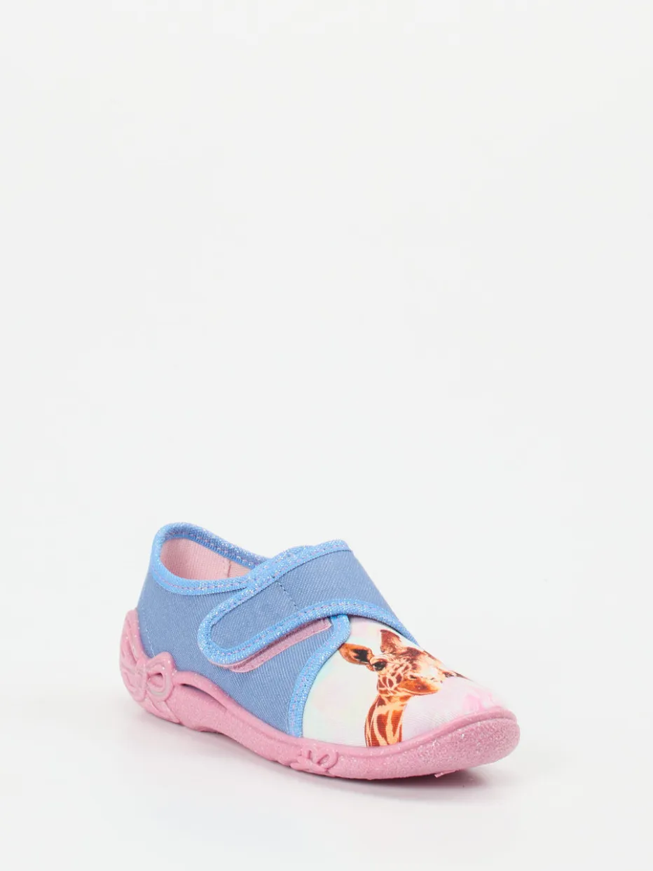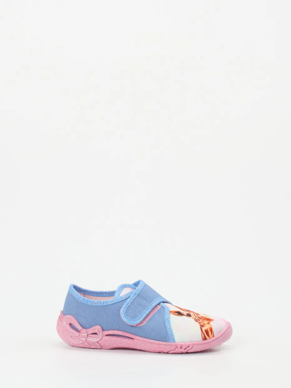 Ob im heimischen Wohnzimmer oder in der Kita – das hellblaue Textilmaterial mit matter Oberfläche bietet ein angenehmes Tragegefühl, während der praktische Klettverschluss das An- und Ausziehen erleichtert. Das liebevoll gestaltete Giraffenmotiv auf dem Vorderblatt sorgt für fröhliche Akzente, ergänzt durch rosa Glitzerdetails am Schaftabschluss. Die flexible Gummisohle mit rutschhemmendem Ballerinaprofil und geprägten Schmetterlingen unterstützt sicheres Laufen auf glatten Böden. Harmonisch fügt sich der Schuh in den Trend zu pastelligen Kindertönen und Tierprints ein und lässt sich ideal zu Pyjamas oder Haussocken kombinieren.