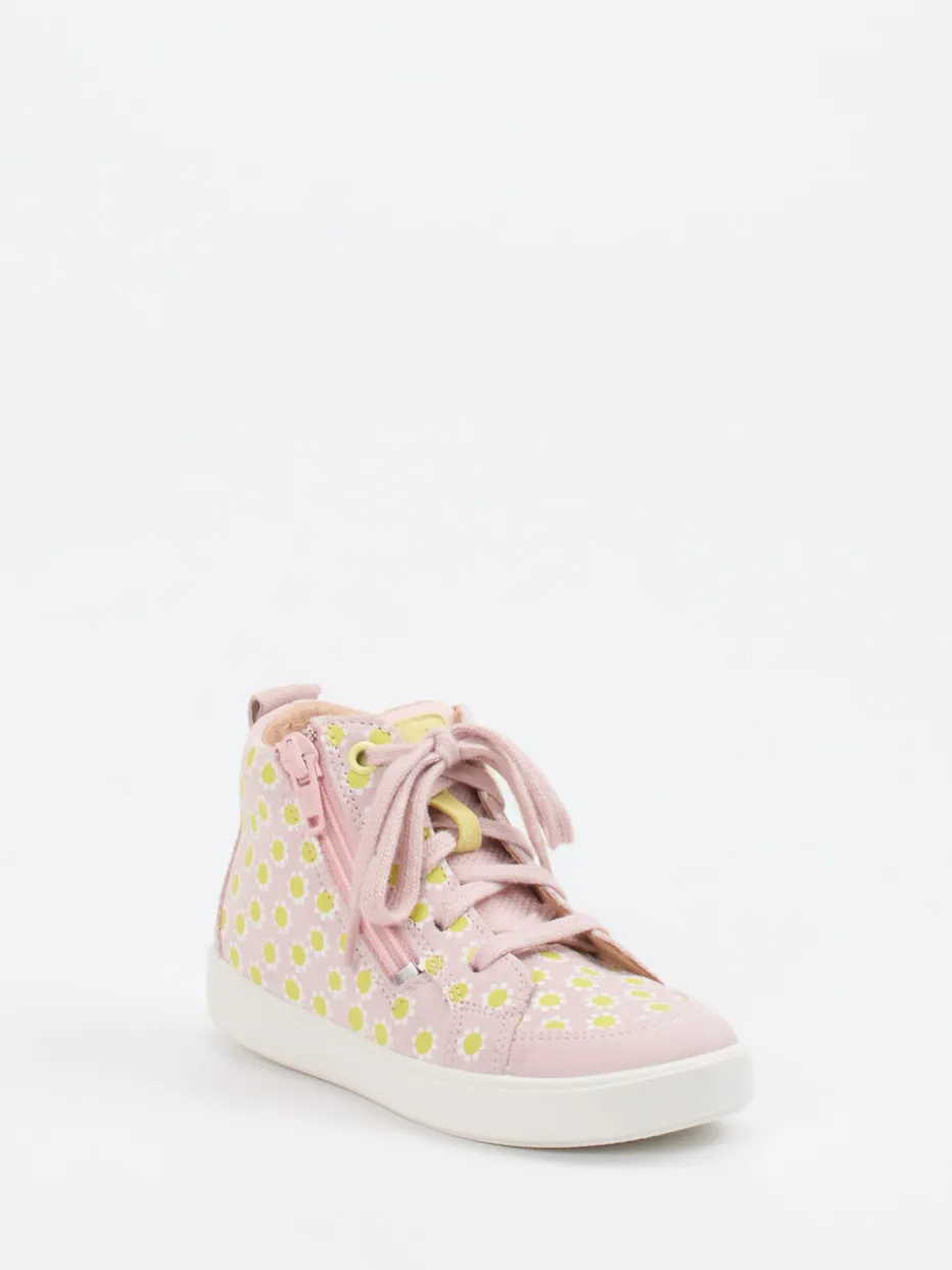 Blumenliebe in Pastell.Mit diesem High-Top Sneaker präsentiert Superfit ein frisches Modell für die Kinder-Freizeit. Ideal für Kita oder Spielplatz: Das geprägte Veloursleder mit samtiger Haptik zeigt ein pastellrosafarbenes Finish und ein fröhliches Gänseblümchenmuster in Weiß und Hellgelb. Die klassische rundliche Form kombiniert Schnürung mit funktionalem Reißverschluss samt Zuglasche – praktisch beim täglichen Anziehen. Eine besonders leichte PU-Sohle sorgt für hohen Laufkomfort, während das natürliche Lederfutter innen ein angenehmes Tragegefühl unterstützt. Inspiriert von Retro-Kindermode trifft kindgerechtes Design hier auf aktuelle Pastelltrends. Mit durchdachter Funktionalität und viel Liebe zum Detail überzeugt Superfit im verspielten Kids-Segment.