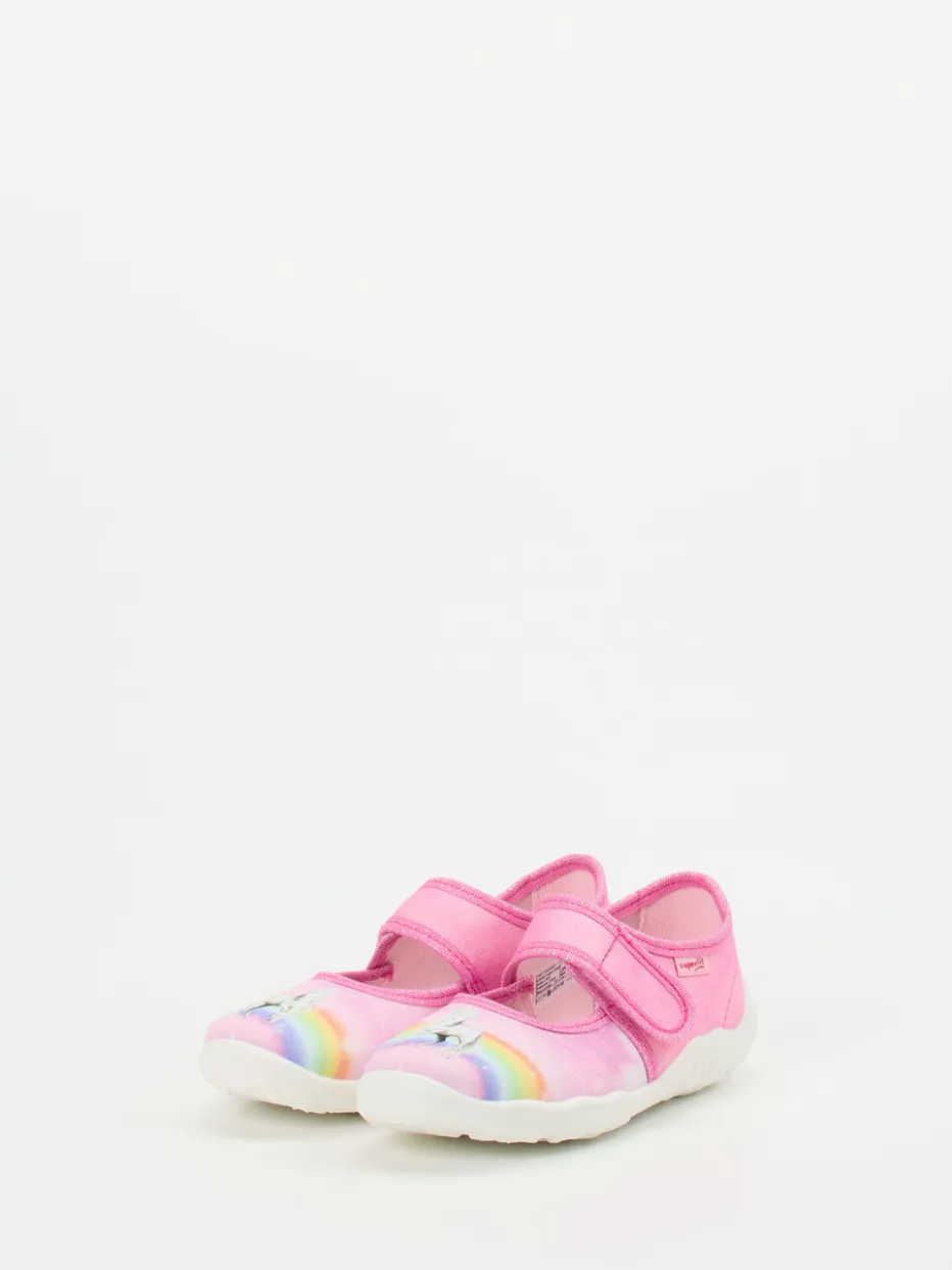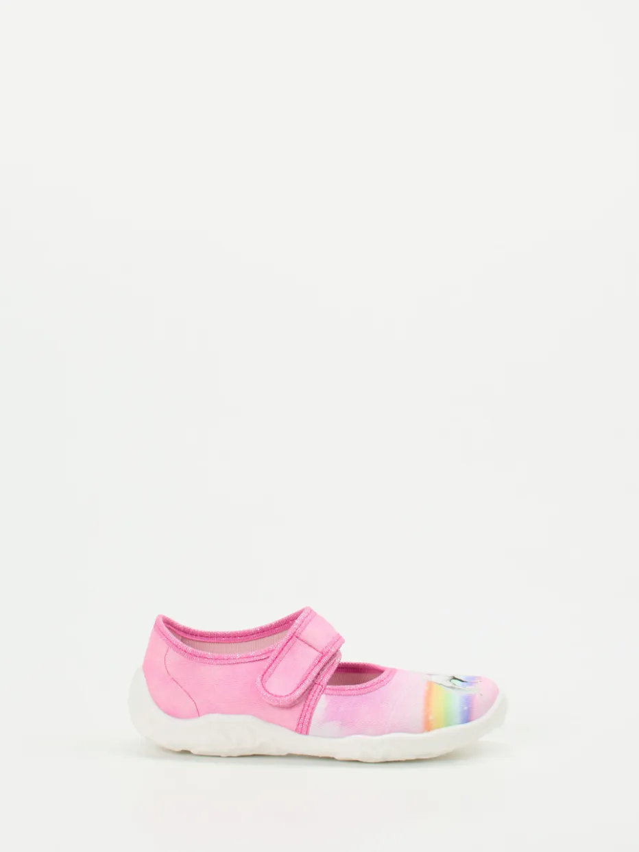 Ein Einhorn für jeden Tag.Superfit präsentiert einen charmanten Hausschuh für Kinder. Ideal für Spielstunden im Kinderzimmer: Das rosa Textilmaterial ist matt gearbeitet und begeistert mit einem aufgedruckten Einhorn und Regenbogenmotiv. Ein glitzernder Kantenbesatz und der praktische Klettverschluss setzen zusätzliche Akzente. Die weiße Gummisohle zeigt ein florales Profil und sorgt für guten Halt auf glatten Böden. Inspiriert vom Y2K-Revival bringt das Modell fröhliche Pastellfarben in den Alltag. Harmoniert besonders gut mit bunten Pyjamas oder Accessoires im Fantasy-Look. Superfit garantiert komfortable Leichtigkeit in verträumtem Design.