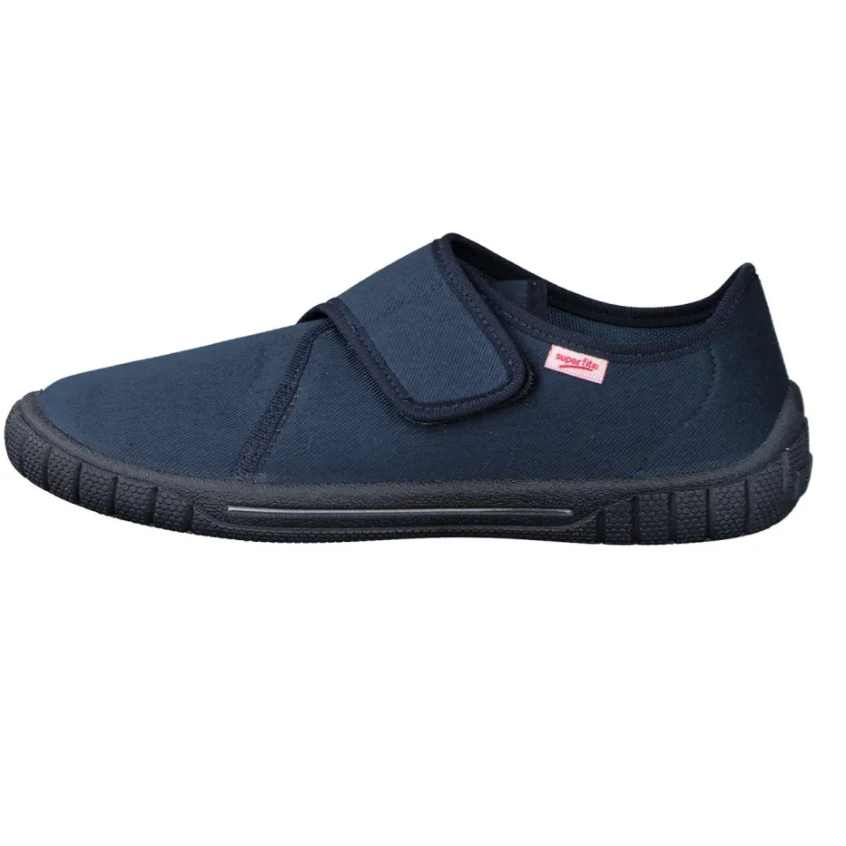 Bequem durch den Tag.Superfit liefert mit diesem Kinderhausschuh eine komfortorientierte Lösung für den Alltag im Haus. Das pflegeleichte Textilobermaterial zeigt sich in einem zeitlosen Dunkelblau mit matter Oberfläche. Ein breiter Klettverschluss erleichtert das An- und Ausziehen, während das Innenfutter aus Baumwoll-Textil für ein angenehmes Trageklima sorgt. Die flexible Gummisohle ist an der Ferse hochgezogen – ein funktionales Plus für aktive Kinder. Label-Details und Ton-in-Ton-Nähte unterstreichen den cleanen Look, inspiriert vom aktuellen Minimalismus-Trend. Passt ideal zu Jogpants oder einem Hausanzug. Zuverlässiger Halt und unkomplizierter Komfort – typisch Superfit.