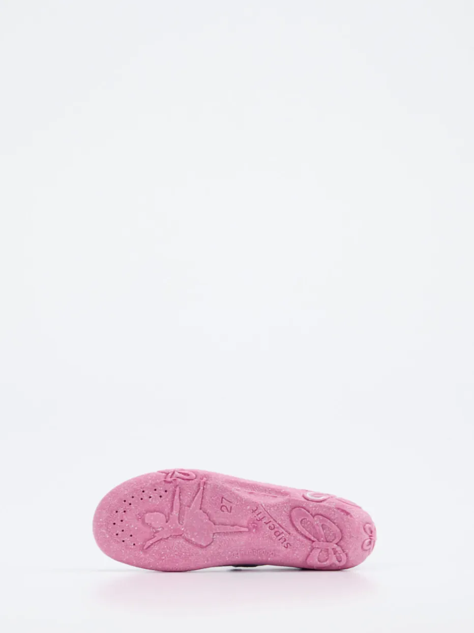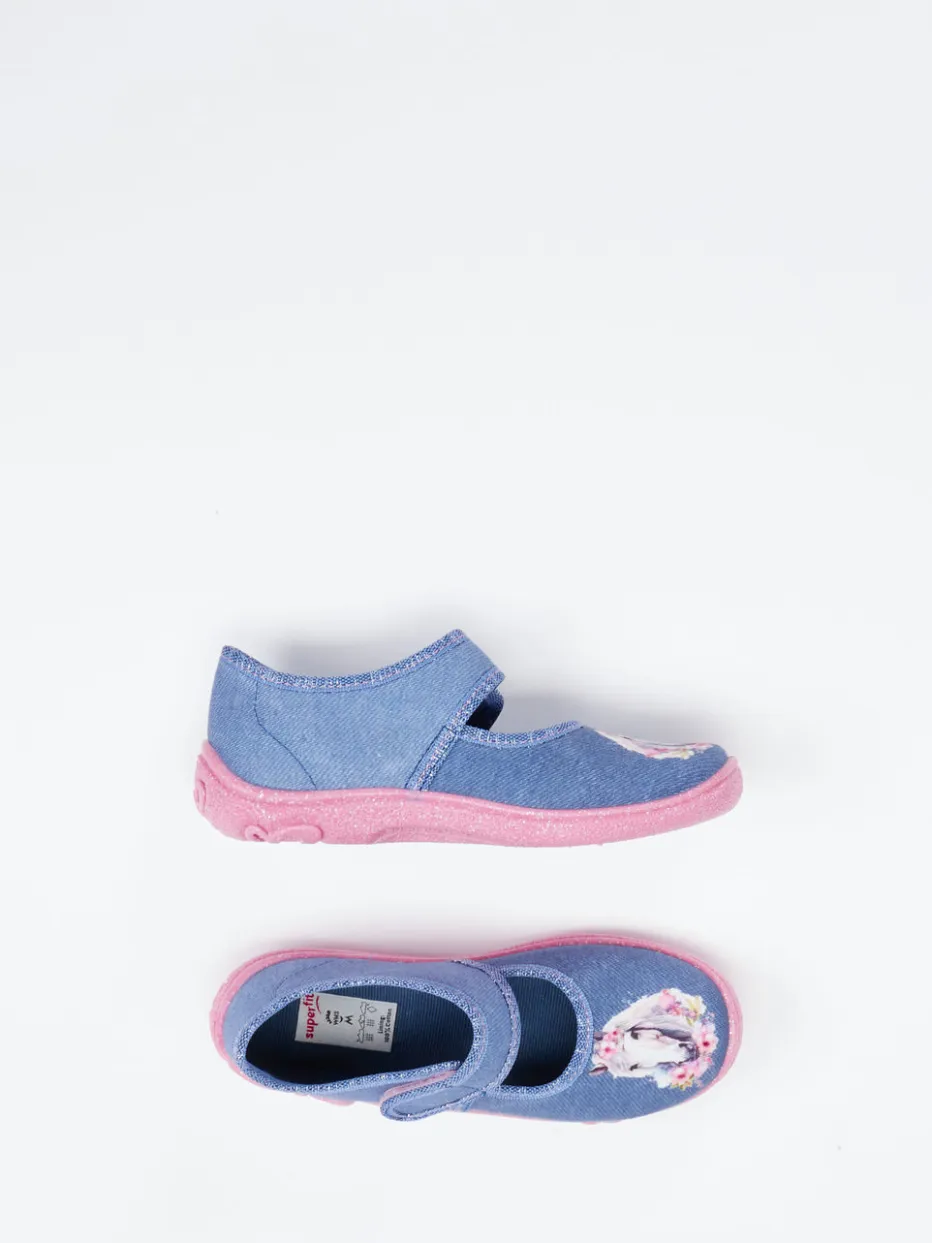 Superfit präsentiert einen liebevoll gestalteten Kletthausschuh für Kinder. Die jeansblaue Textilbasis wird durch strukturierte Oberflächen sowie ein florales Einhorn-Motiv betont. Zierschleifenprägung und eine rosafarbene Glitzersohle mit Schmetterlingsprofil unterstreichen den verspielten Look. Der Klettverschluss sorgt dabei für kinderleichte Handhabung. Dank flexibler PU-Sohle bietet der Schuh sicheren Halt im Hausalltag. Der Hausschuh greift aktuelle Pastelltrends auf und passt wunderbar zur Lieblingsleggings oder einem gemütlichen Hausanzug.