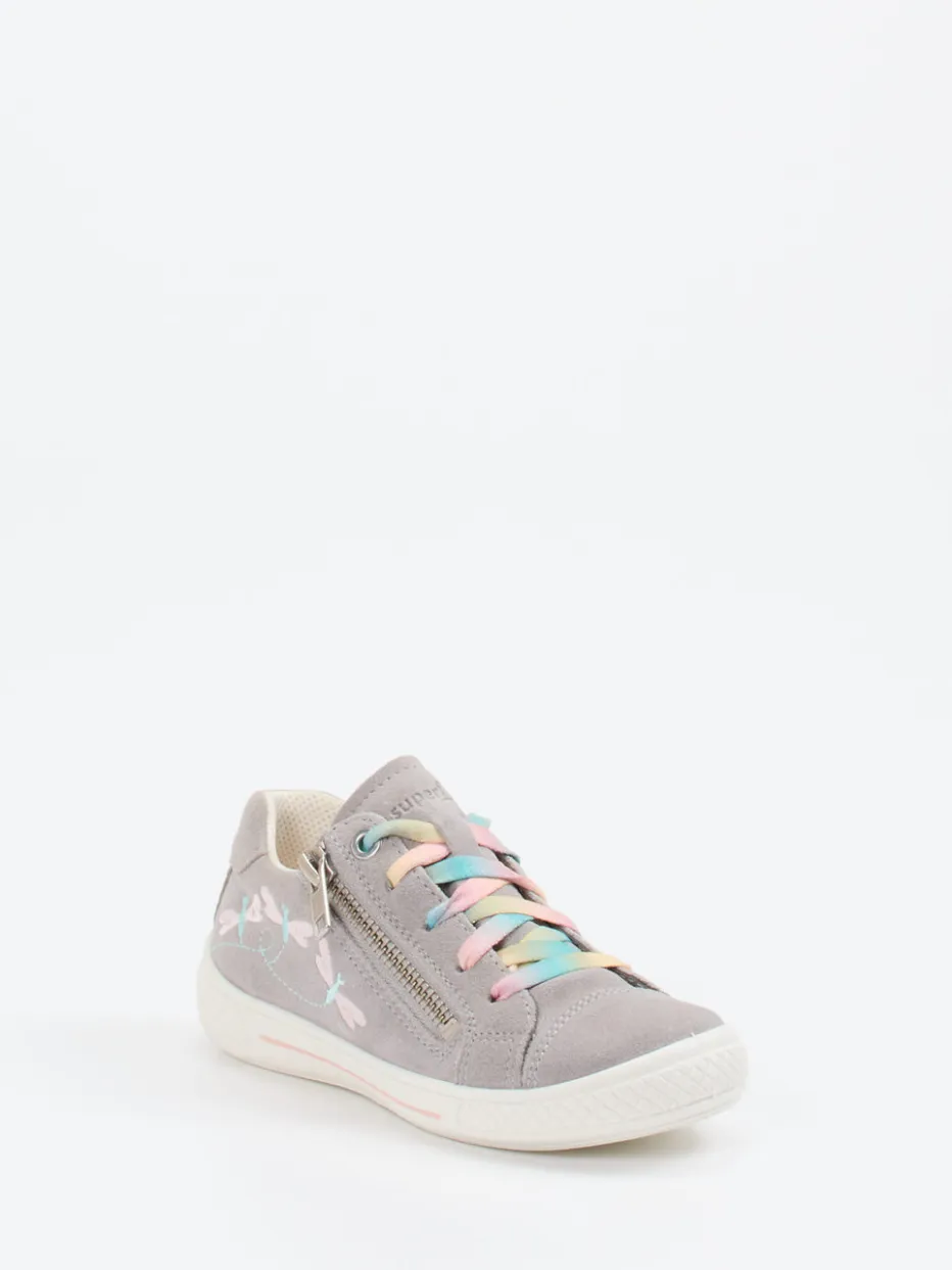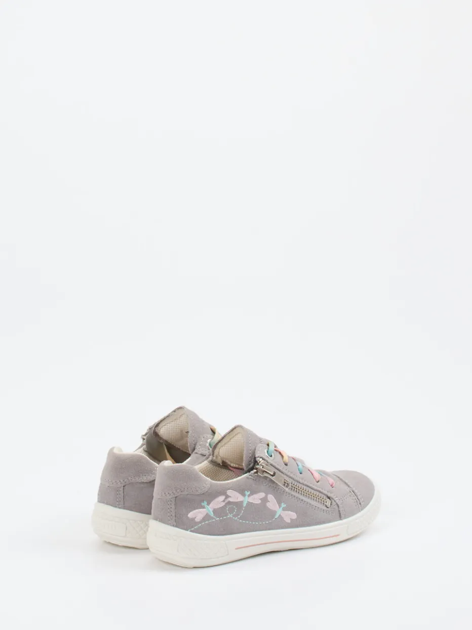 Ideal für aktive Tage im Spielzimmer oder Garten überzeugt das Modell durch hochwertiges Veloursleder mit matter Oberfläche und weichem Textilfutter. Die hellgraue Farbgebung wird durch rosa und hellblaue Akzente sowie eine liebevolle Libellen-Stickerei harmonisch ergänzt. Schnürsenkel im Farbverlauf und ein praktischer seitlicher Reißverschluss ermöglichen kindgerechtes An- und Ausziehen. Die flache Silhouette in Kombination mit der profilierten Gummisohle bietet Stabilität und Rutschfestigkeit. Ein modisches Highlight für die kommende Pastelltrend-Saison.