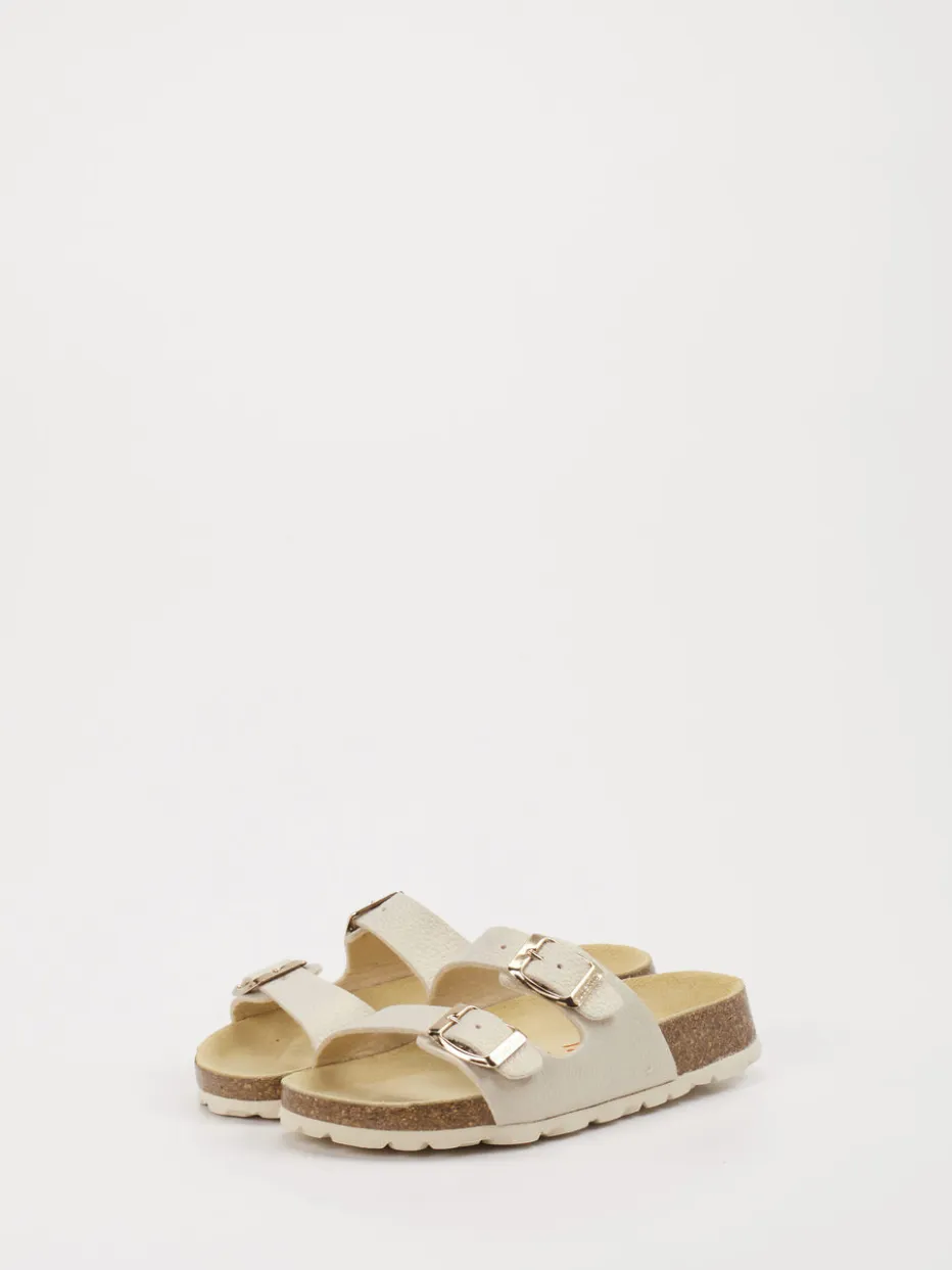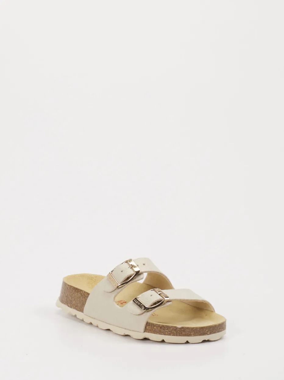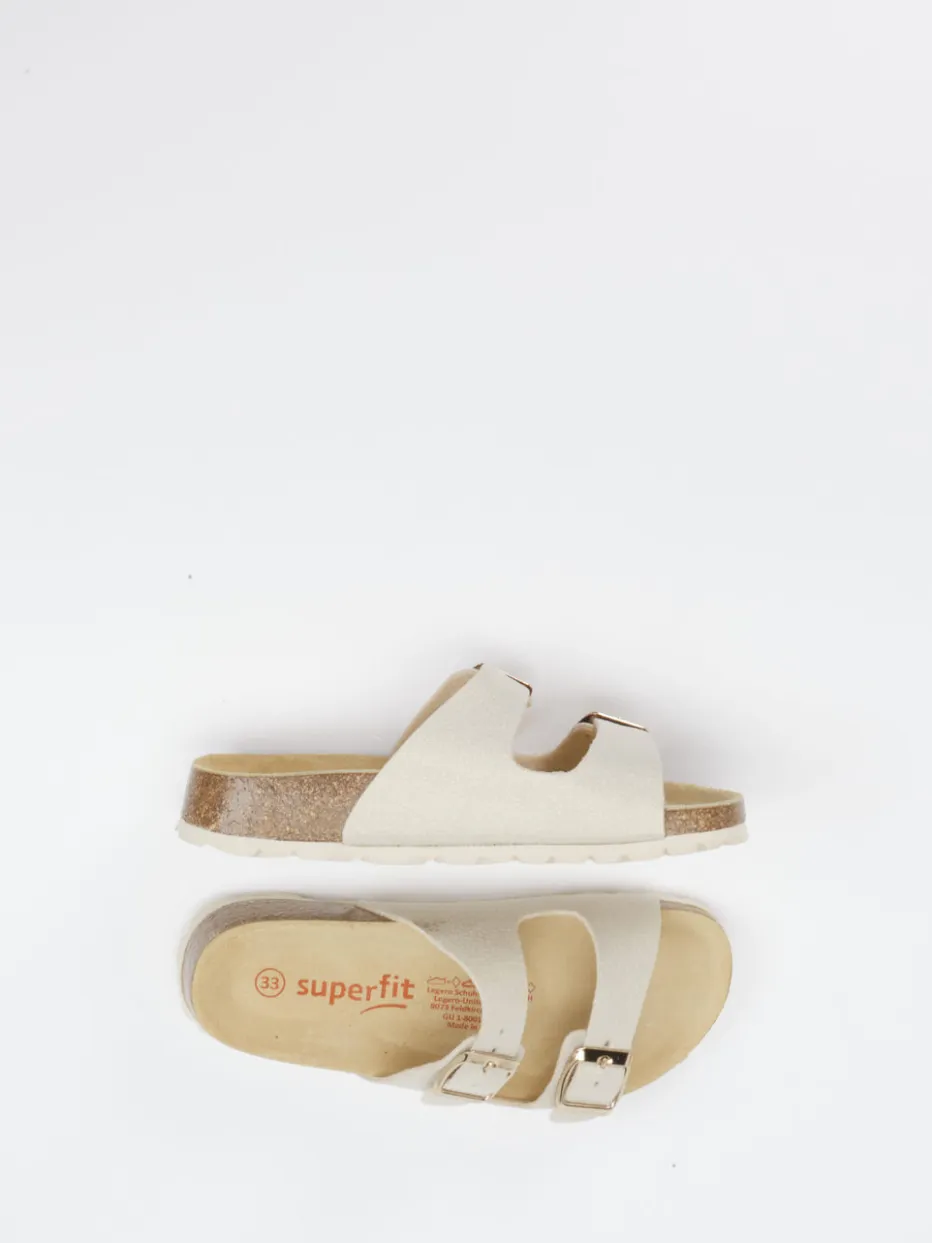 Sommerkomfort für kleine Füße. Superfit präsentiert eine bequeme Zwei-Riemen-Pantolette für Kinder – ideal für Alltag und Freizeit. Ob beim Spielen im Garten oder beim Entspannen zu Hause, diese offene Sandale überzeugt durch ihr ergonomisch geformtes Korkfußbett und eine profilierte PU-Laufsohle, die Trittsicherheit bietet. Das beige Synthetik-Obermaterial mit genarbter Oberfläche harmoniert mit goldfarbenen Metallschnallen, die sich individuell anpassen lassen. Die flache Silhouette und das dezente Design fügen sich mühelos in sommerliche Casual-Looks ein. Optimal kombinierbar mit Shorts und hellen Shirts. Ein funktionales Modell mit Fokus auf Komfort und minimalistischer Ästhetik – typisch Superfit.