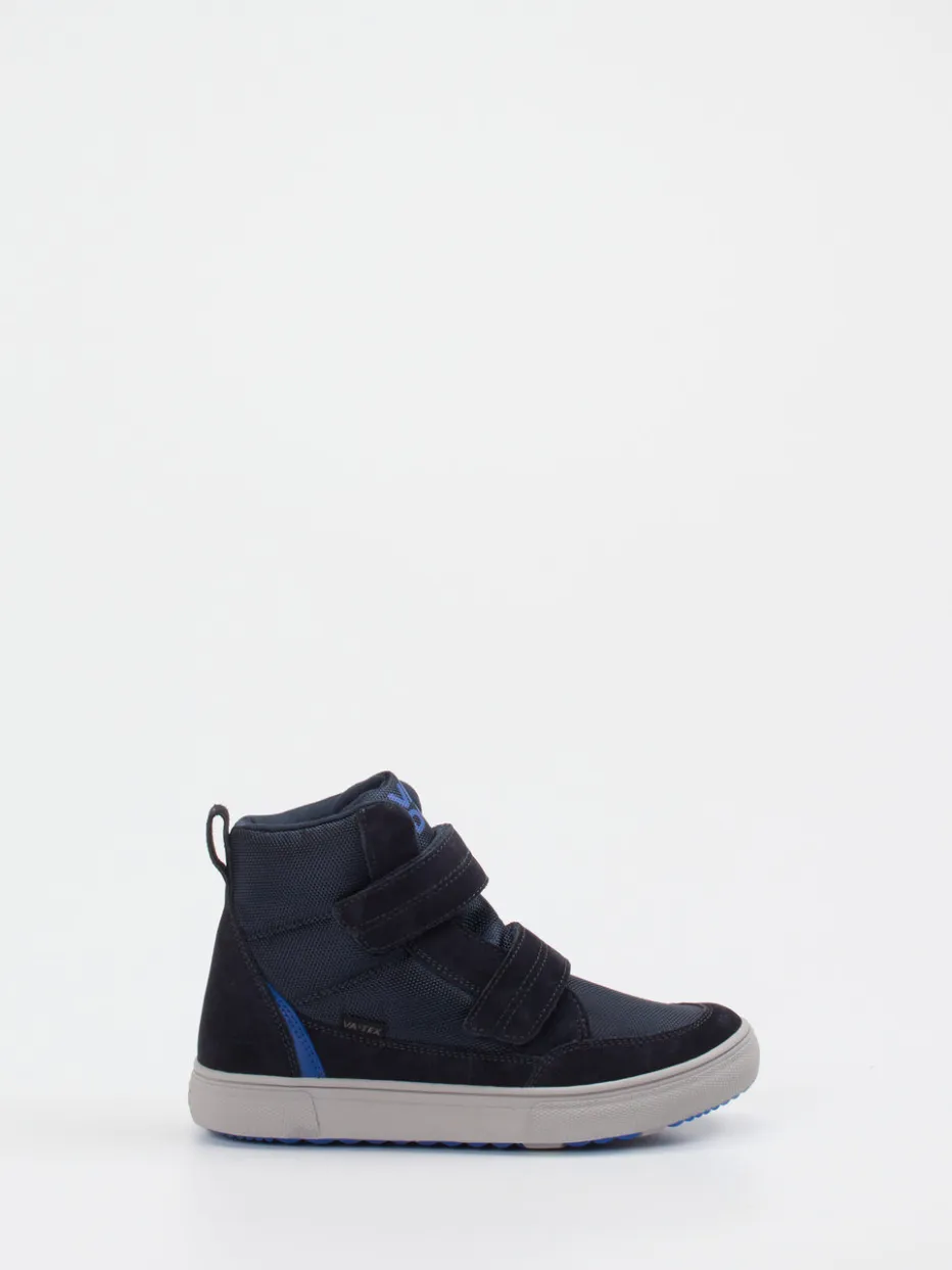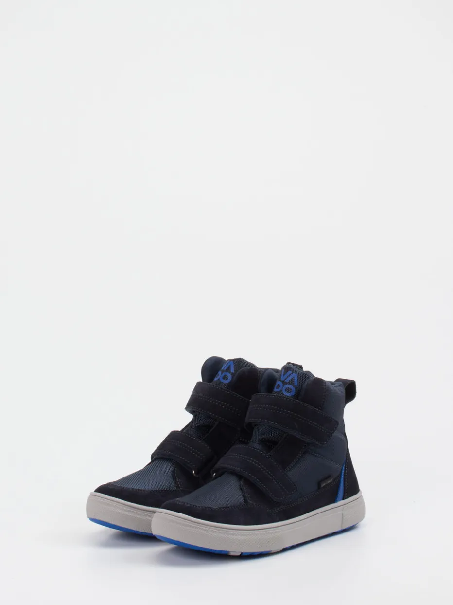 Für Bewegung gemacht.Vado liefert mit diesem High-Top-Sneaker für Kinder einen strapazierfähigen Begleiter für dynamische Tage. Ob auf dem Spielplatz oder auf Wanderwegen – dieser Schuh schützt bei jedem Wetter durch die wasserabweisende V-TEX-Membran. Das hochwertige Veloursleder zeigt sich samtig-matt und ist tonig vernäht. In sattem Dunkelblau mit kobaltblauen Akzenten gehalten, bietet das Modell eine klassische, hochgeschlossene Silhouette mit praktischem Klettverschluss und Zuglasche. Rutschfeste Flex-Zonen in der Gummisohle sorgen für sicheren Tritt. Passt perfekt zu Outdoorjacke und robuster Kinderhose. Vado vereint durchdachte Funktion mit sportlich-urbanem Design.