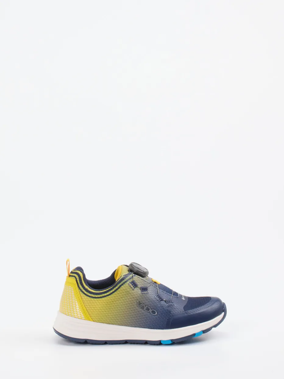 Für kleine Entdecker in Bewegung.Vado präsentiert mit diesem Kinder-Sneaker ein funktionales Modell für Alltag und Freizeit. Ideal für aktive Stunden im Freien überzeugt der Low-Top durch ein robustes, atmungsaktives Textil-Obermaterial mit matter Meshstruktur. Die sportliche Silhouette kommt in einem dynamischen Farbverlauf aus Dunkelblau, Gelb und Hellblau zur Geltung. Ein BOA-Drehverschluss ersetzt klassische Schnürsenkel und erleichtert das Anziehen spürbar. Reflektierende Elemente an der Ferse erhöhen die Sichtbarkeit bei Dämmerung. Streetwear-inspirierte Details und Techwear-Anklänge machen den Sneaker zum Trendstück der Saison. Kindgerecht durchdachtes Design für Komfort und Mobilität von Vado.