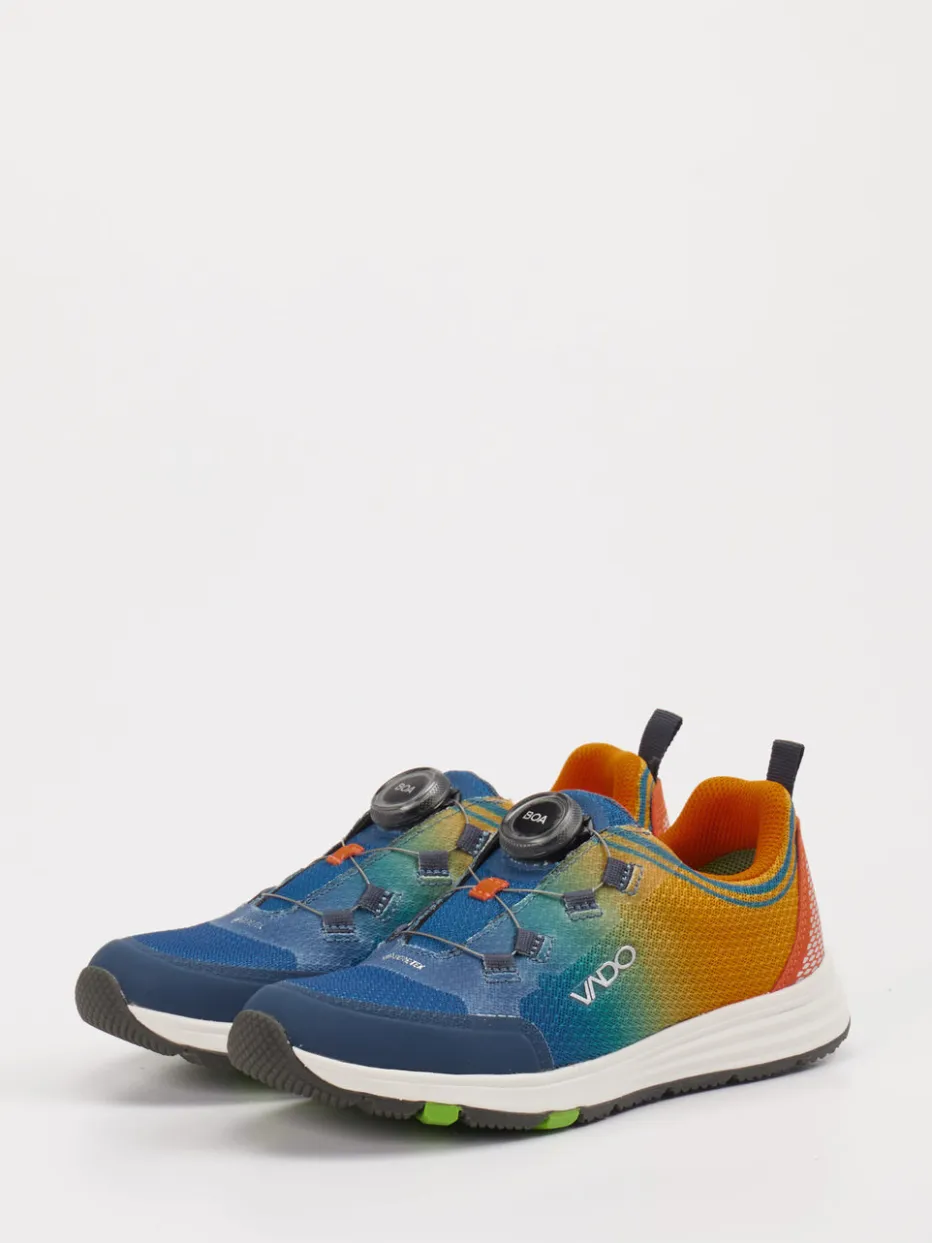 Der Vado Kindersneaker überzeugt als funktionales Leichtgewicht für den Alltag und Outdoor-Einsätze. Mit seinem atmungsaktiven Textilmaterial und der robusten Gummisohle bietet er optimalen Komfort bei jeder Bewegung. Das Obermaterial zeigt eine textilartige Oberfläche mit blauem Farbverlauf im Color-Blocking-Stil – Kontraste in Orange und Grün setzen markante Akzente. Reflektierende Elemente und das BOA-Drehverschlusssystem sorgen für sicheren Halt und einfache Handhabung. Die flexible Silhouette und das GORE-TEX-Material machen ihn zur wetterfesten Option für sportlich-lässige Looks. Ideal kombinierbar mit Outdoorjacke oder Funktionsrucksack. Technische Funktion trifft auf farbenfrohes Design – typisch Vado.