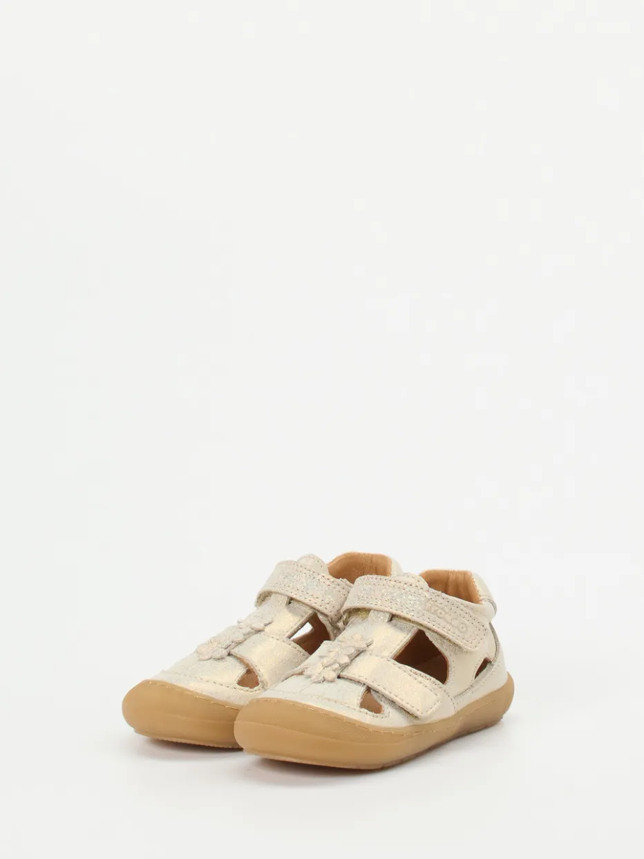 Funkelnd komfortabel in den Sommer.Froddo präsentiert mit dieser Kindersandale ein bequemes Modell mit geschlossener Zehenpartie – perfekt für Alltag und Freizeit. Das geprägte Leder zeigt sich goldfarben und sorgt mit zartem Glitzereffekt auf den Riemchen für ein verspieltes Finish. Zwei Klettverschlüsse ermöglichen eine sichere Passform, während die honigfarbene Gummisohle flexibel und rutschhemmend verarbeitet ist. Die abgerundete Silhouette sowie die vollständig geschlossene Ferse stützen kleine Kinderfüße beim Laufen und Spielen. Floral platzierte Blütenakzente runden den Look kindgerecht ab. Kombiniert mit einer leichten Sommermütze ergibt sich ein stilsicheres Outfit. Froddo steht für hochwertige Materialien und funktionale Designs für Kinderfüße.