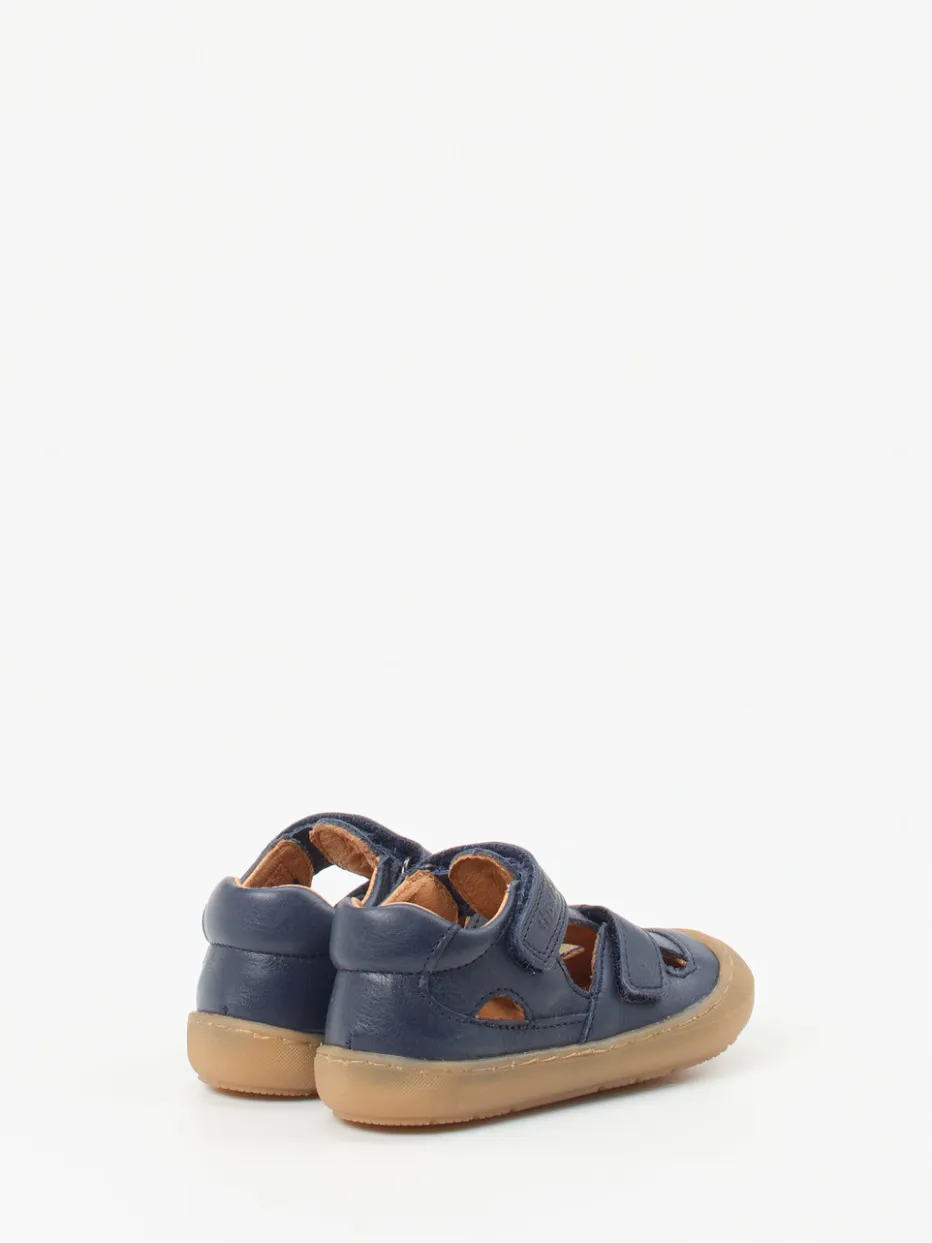 Schützt kleine Füße mit Stil.Die Marke Froddo präsentiert hier funktionale Kindersandalen für Alltag und Freizeit. Ob beim Toben im Garten oder auf sommerlichen Spaziergängen – das robuste, dunkelblaue Kalbleder mit mattierter Oberfläche bietet zuverlässigen Halt und schützt durch die geschlossene Zehenpartie. Zwei praktische Klettverschlüsse ermöglichen ein passgenaues Anziehen, während das Lederfutter und das gepolsterte Fußbett für angenehmen Tragekomfort sorgen. Die honigfarbene Gummisohle ist rutschhemmend und leicht flexibel. Ton-in-Ton-Nähte, eine abgerundete Form sowie das geprägte Markenlogo unterstreichen das minimalistisch-skandinavische Design ideal. Kombinierbar mit Shorts, Kleidern oder leichten Hosen. Ein alltagstauglicher Sommerschuh mit langlebiger Verarbeitung und kindgerechter Funktion.