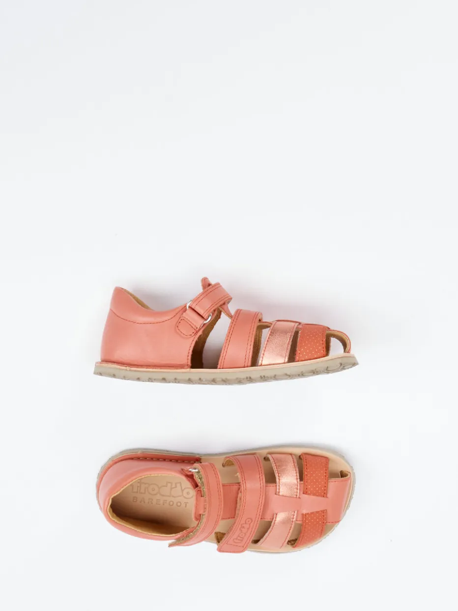 Die Marke Froddo bietet mit dieser geschlossenen Kindersandale ein durchdachtes Modell für Alltag und Urlaub. Gefertigt aus feinem Kalbleder mit samtiger Oberfläche in leuchtendem Koralleton, kombiniert das Design eine komfortfreundliche Form mit stabiler geschlossener Ferse und sicherem Klettverschluss. Rosé-goldene Metallic-Elemente setzen stilvolle Akzente, während die flexible Gummisohle für rutschfesten Halt sorgt. Das weich gepolsterte Lederfutter schafft ein angenehmes Tragegefühl – inspiriert vom Barfußprinzip. Ideal zu lockeren Sommerhosen oder Kleidern. Froddo verbindet Ergonomie mit einem trendbewussten Look für Kinderfüße.