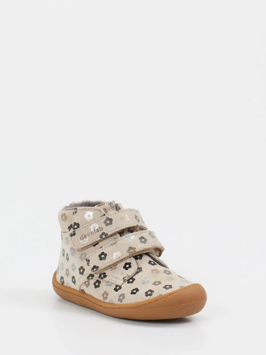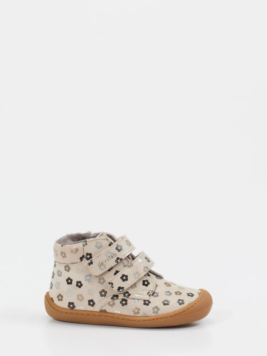 Stabiler Begleiter für kleine Schritte.Develab präsentiert robuste gefütterte Klett-Boots für Kinder. Ideal für aktive Tage in der kalten Jahreszeit: Das geprägte Leder trifft hier auf ein flauschiges Lammfellfutter und zeigt sich in einem beigen Farbton mit zartem Metallic-Blumenprint. Der knöchelhohe Schnitt bietet Stabilität, während der kinderfreundliche Klettverschluss einen unkomplizierten Einstieg ermöglicht. Eine rutschfeste Gummisohle sorgt für Trittsicherheit auf nassem oder frostigem Untergrund. Optisch spielt das Modell mit skandinavischen Retro-Referenzen und kindgerechtem Design. Ein Kinderschuh mit Komfortfaktor und funktionalem Winterstil.