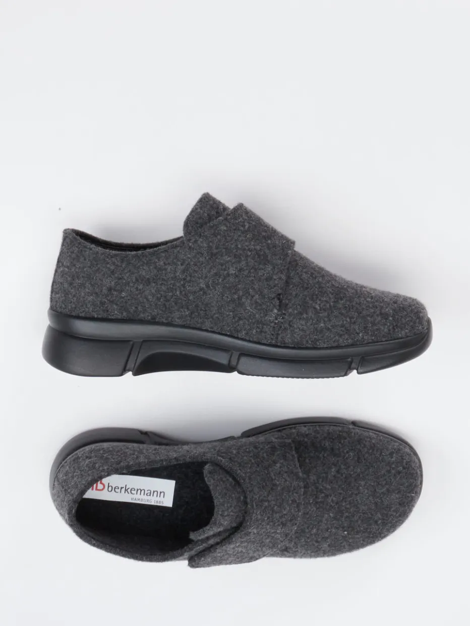 Wohltuender Komfort für entspannte Stunden. Der Hausschuh von Berkemann kombiniert funktionales Design mit einem hochwertigen Filzmaterial. Für ruhige Momente zu Hause oder legere Alltagssituationen sorgt der graue Klettslipper mit seiner weich strukturierten Oberfläche für angenehme Wärme. Die ergonomisch geformte Gummisohle mit zusätzlichem Dämpfungselement unterstützt den Fuß spürbar bei jedem Schritt. Der breite Klettverschluss erleichtert das An- und Ausziehen, während die abgerundete Form das minimalistische Gesamtbild unterstreicht. Trendig im Stil und funktional in der Ausführung, ist er ideal für ein komfortbewusstes Publikum. Berkemann vereint zeitlosen Stil mit praktischem Komfort auf gehobenem Niveau.