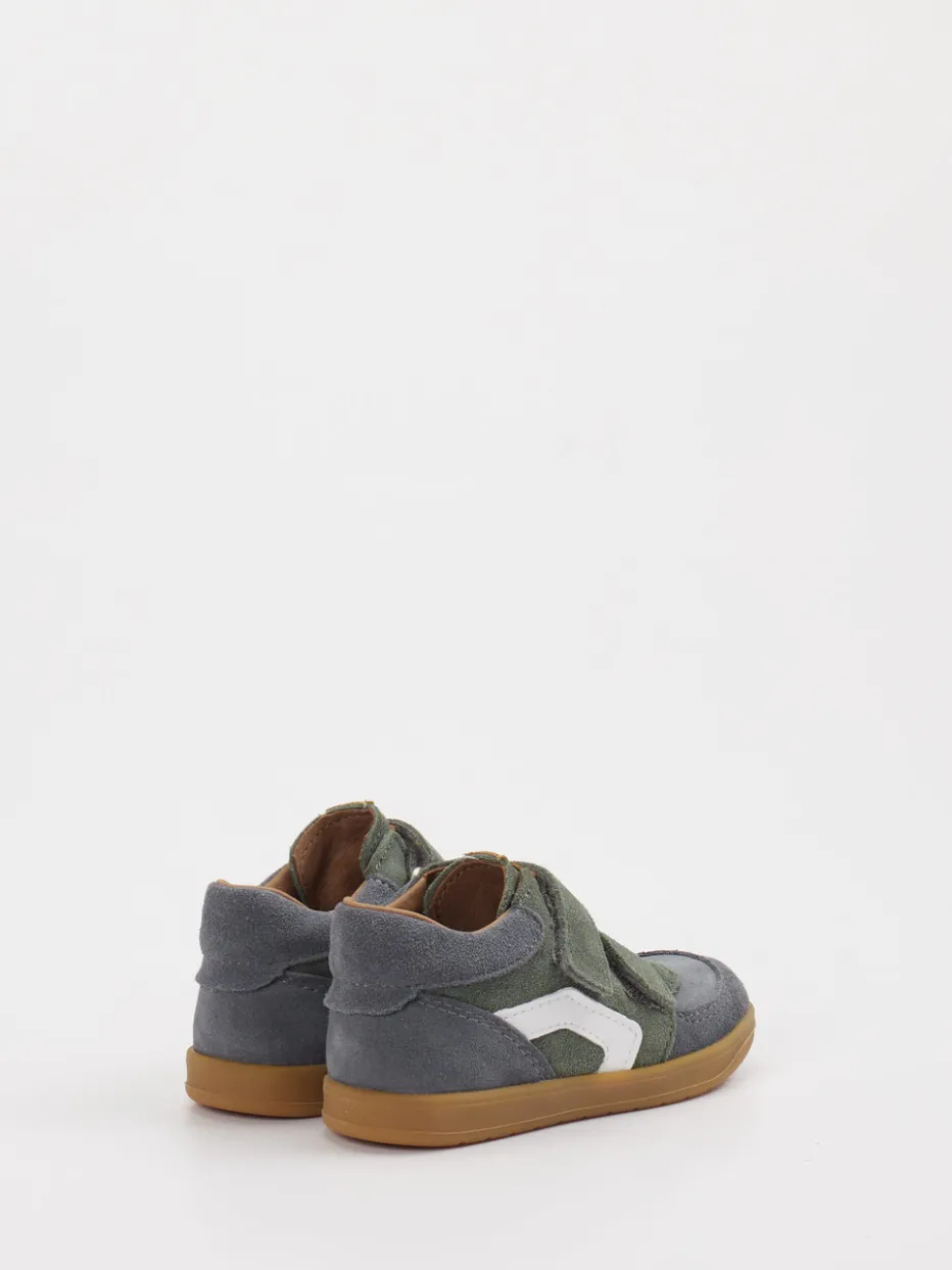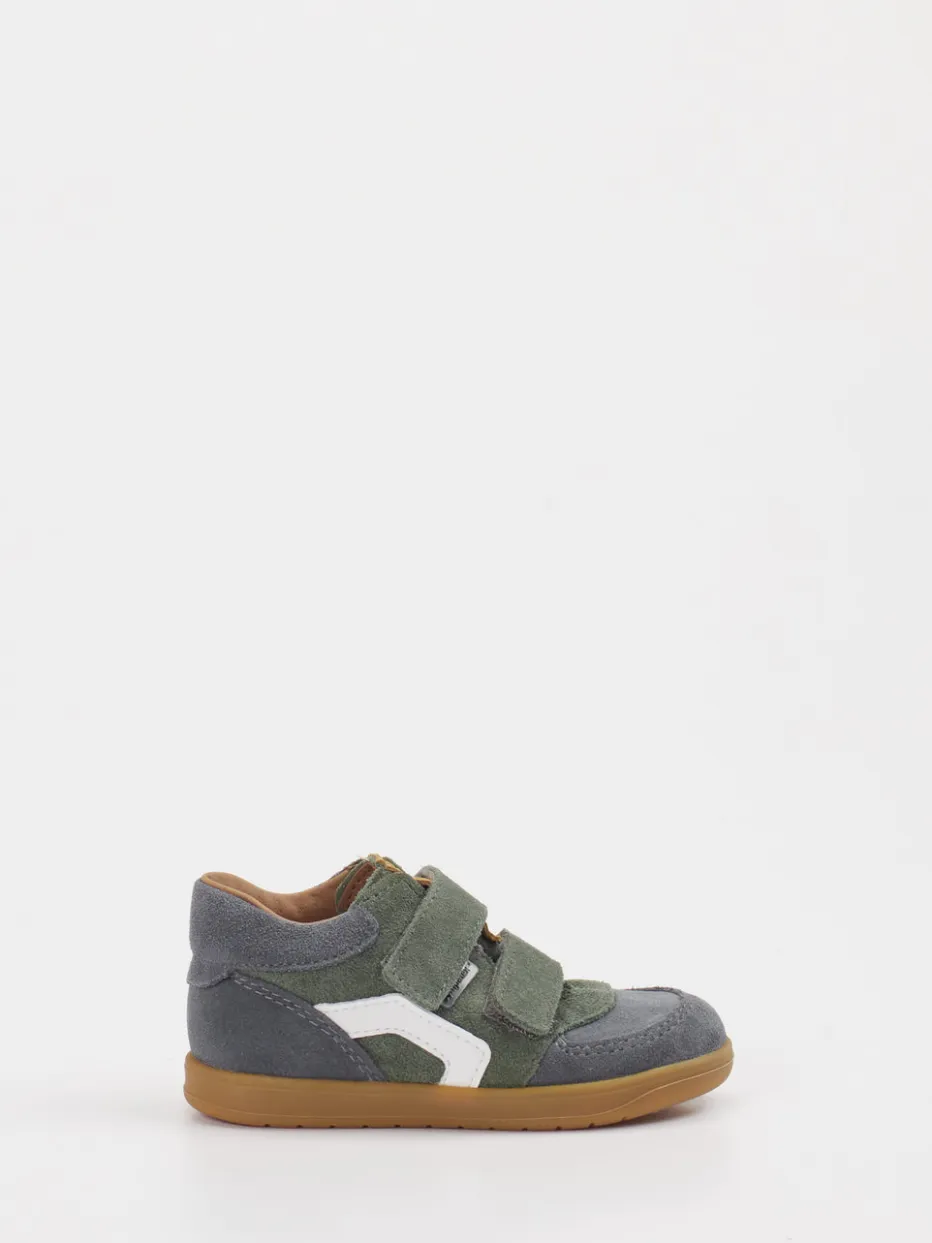 Gefertigt aus weichem Veloursleder mit matter Oberfläche zeigt sich das Modell in Olivgrün mit schiefergrauen und hellbraunen Akzenten. Die klassische Form mit gepolstertem Schaft sorgt für angenehmen Sitz, während der doppelte Klettverschluss das An- und Ausziehen erleichtert. Die rutschhemmende Gummisohle unterstützt sicheres Laufen. Ein weißer Applikationsstreifen an der Seite setzt einen sportiven Akzent im angesagten Retro-Stil.
