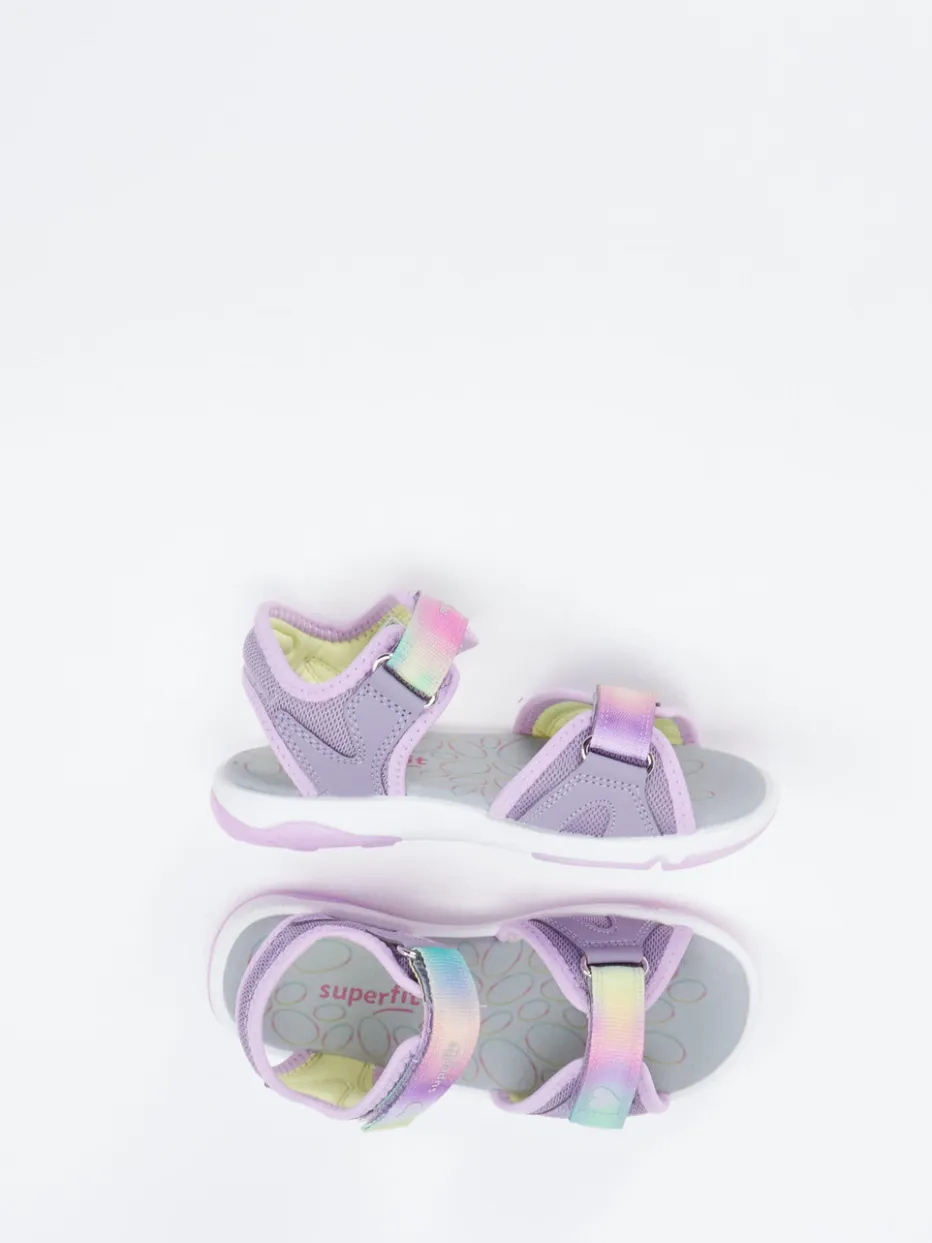 Farbenfroher Sommerbegleiter für kleine Abenteurerinnen.Superfit bringt mit dieser Mädchensandale aus der Kategorie Klettsandalen einen besonders verspielten Stil hervor. Ideal für Freizeit und Urlaub überzeugt das Modell aus robustem Synthetikmaterial mit Mesh-Einsätzen durch seine angenehme Haptik und gute Luftzirkulation. Das dominante Flieder wird durch pastellorange und mintgrüne Akzente ergänzt. Regenbogenfarbene Klettverschlüsse mit reflektierenden Herzchen verleihen dem ergonomischen Design einen verspielten Touch. Eine rutschhemmende PU-Gummisohle rundet die Alltagstauglichkeit optimal ab – besonders auf sommerlichen Untergründen. Der Look harmoniert ideal mit farblich abgestimmtem Rucksack oder Mütze. Sitzen bequem, sehen fröhlich aus – typisch Superfit.