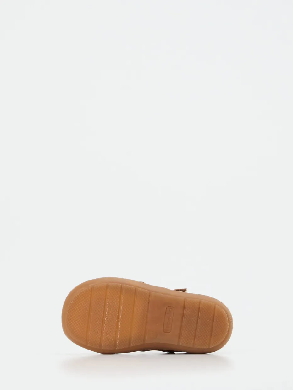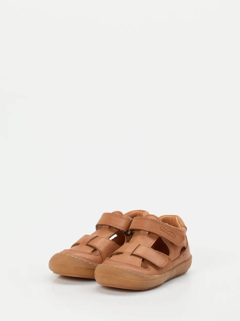 Praktischer Komfort für kleine Entdecker.Froddo präsentiert modische Klettsandalen für Kinder. Ideal für Spielplatzabenteuer oder den Alltag: Das cognacbraune Kalbleder ist hochwertig und zeigt auf den offenkantig gearbeiteten Riemchen eine natürliche Haptik. Die geschlossene Zehenpartie schützt den Fuß, während doppelte, leicht bedienbare Klettverschlüsse das Anziehen erleichtern. Die flexible, rutschhemmende Gummisohle bietet dabei sicheren Halt. Mit abgerundeter Silhouette und Ton-in-Ton-Nähten überzeugt das Modell durch skandinavisch inspirierten Minimalismus. Kombiniert zu kurzen Hosen oder einem Baumwollhut wirkt der Look mühelos modern. Froddo steht für kindgerechte Passform mit natürlichem Designanspruch.