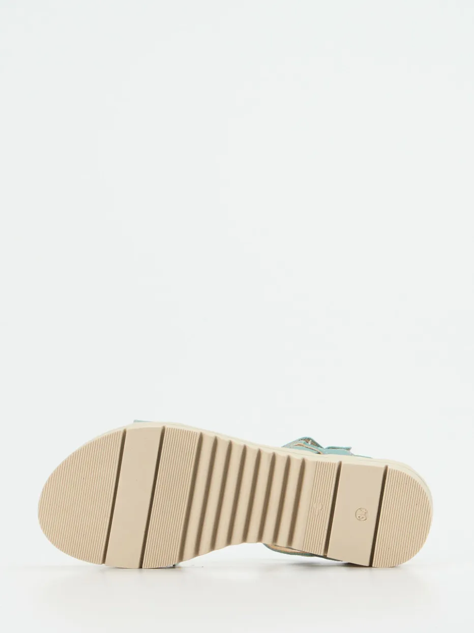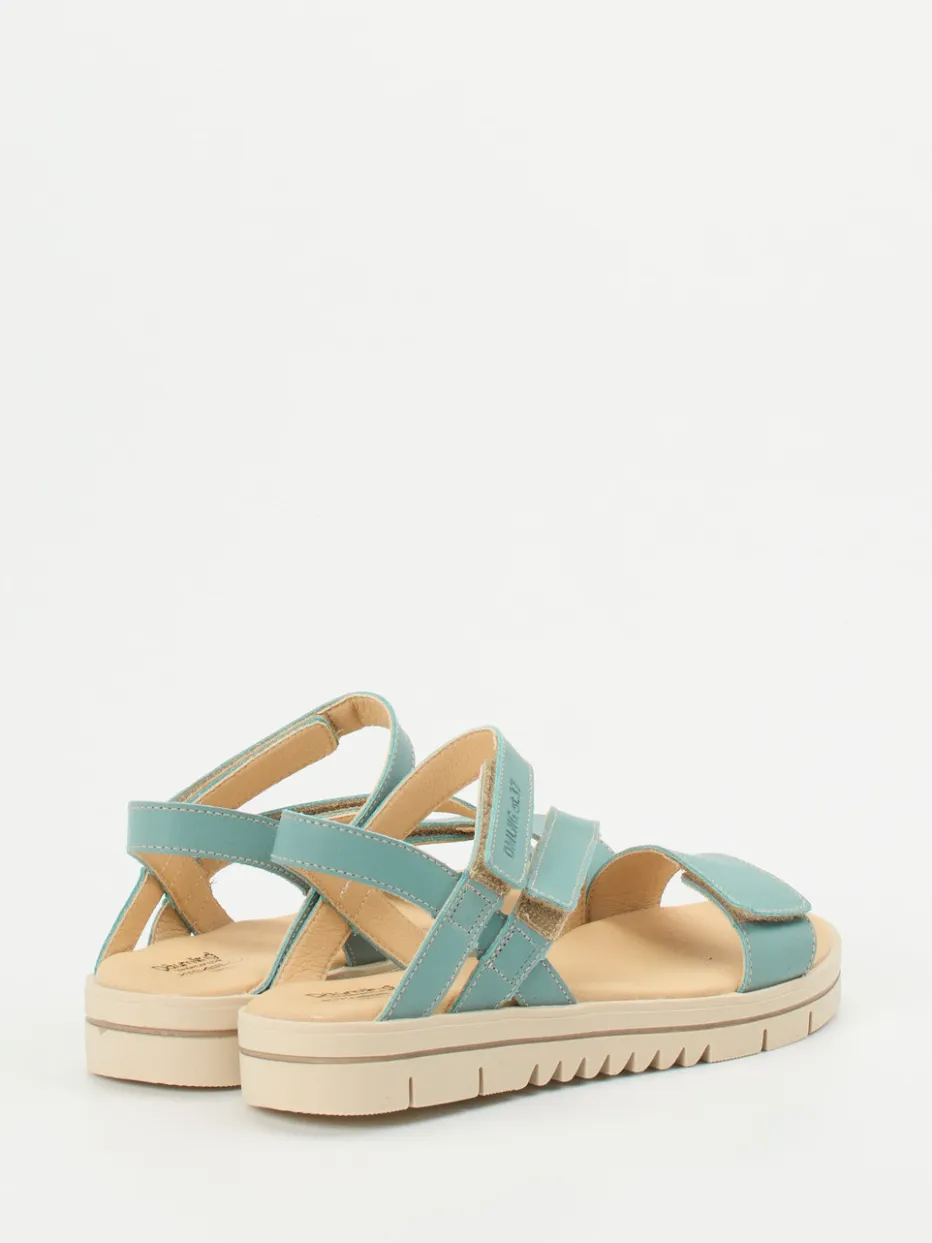 Die Sandalen aus hochwertigem Kalbleder sind in einem stilvollen Aquagrün gehalten und überzeugen mit mattierter Oberfläche und Ton-in-Ton-Nähten. Drei verstellbare Klettverschlüsse sorgen für optimalen Sitz, während die gepolsterte Innensohle und das beige Microfaserfutter angenehmen Tragekomfort gewährleisten. Die profilierte Gummisohle ist rutschfest und flexibel – perfekt für spontane Entdeckungstouren. Minimalistische Streetwear-Elemente verbinden Stil mit Funktionalität. Besonders gut kombinierbar mit leichten Sommerhosen.