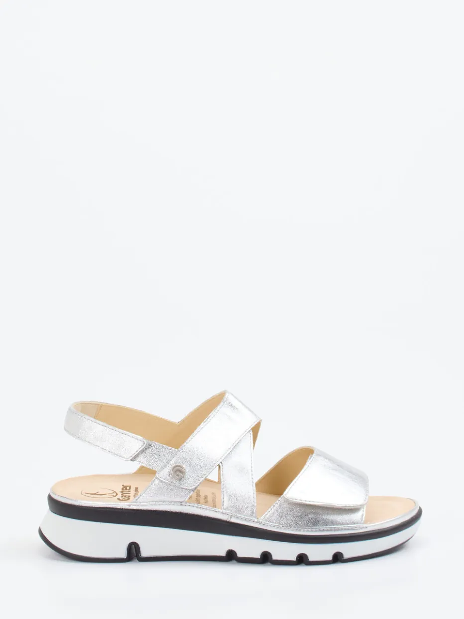 Glanz und Komfort im Sommerlook.Ganter präsentiert mit dieser Damen-Klettsandale ein funktional-ästhetisches Modell für warme Tage. Ideal für Alltag und Urlaub überzeugt die silberfarbene Sandale mit softem Metallicleder, ergonomischem Fußbett und individuell verstellbaren Klettverschlüssen. Die offene Silhouette ist minimalistisch gestaltet, während das glänzende Finish mit schwarz-weißer Kontrastsohle für modische Akzente sorgt. Innenfutter und wechselbares Fußbett sind aus hochwertigem Leder gefertigt und erhöhen den Tragekomfort. Inspiriert vom Trend zu Metallic Accents passt das Modell hervorragend zu Leinenhosen und luftigen Blusen. Die Ganter-typische Kombination aus Komfort, Stil und Passform macht jedes Sommeroutfit citytauglich.