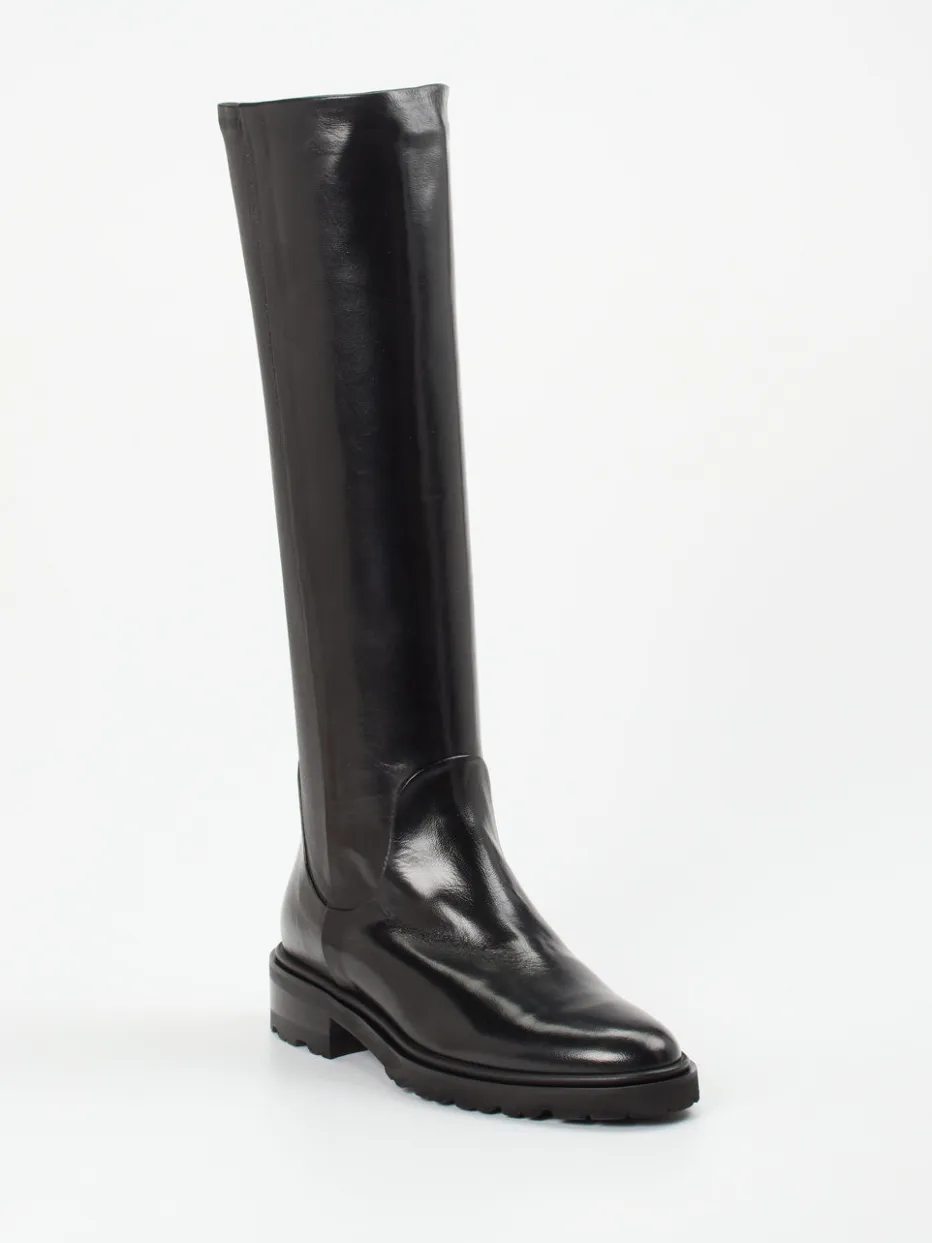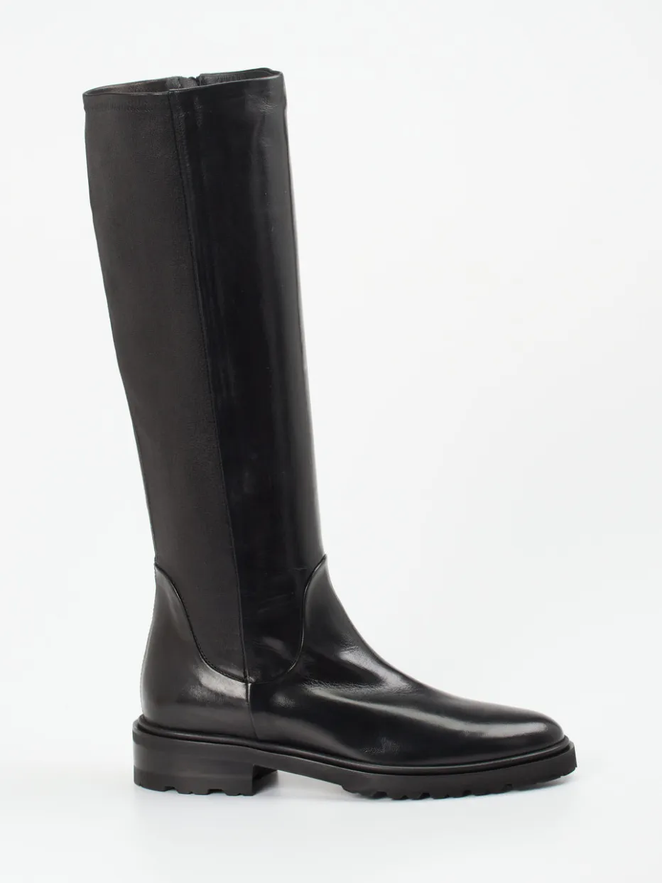 Dieser kniehohe Stiefel aus schwarzem Lammleder überzeugt durch klare Linienführung und hochwertigen Materialkontrast. Mit robuster Profilsohle ideal für modischen Alltag und stilvolles Büro-Outfit.