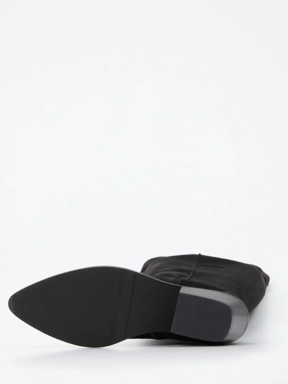 Minimalistischer Chic trifft Retro-Flair.Donna Carolina präsentiert mit diesen kniehohen Stiefeln ein puristisches Damenmodell aus hochwertigem, samtig angeschliffenem Veloursleder. Perfekt für kühle Tage im Büro oder elegante Freizeitmomente überzeugt das Modell mit einem elastischen Schaftbereich, rutschhemmender Gummisohle und einem femininen Blockabsatz von 4 cm. Die schwarze, matte Oberfläche und die klare Linienführung unterstreichen den minimalistischen Look, der durch Retro-Western-Einflüsse modern interpretiert wird. Ton-in-Ton-Nähte und eine strukturierte Laufsohle runden das Design subtil ab. Kombinierbar mit schlichten Kleidern oder Skinny Jeans. Ein stilvoller Begleiter mit Komfort-Plus durch feines Kalblederfutter.