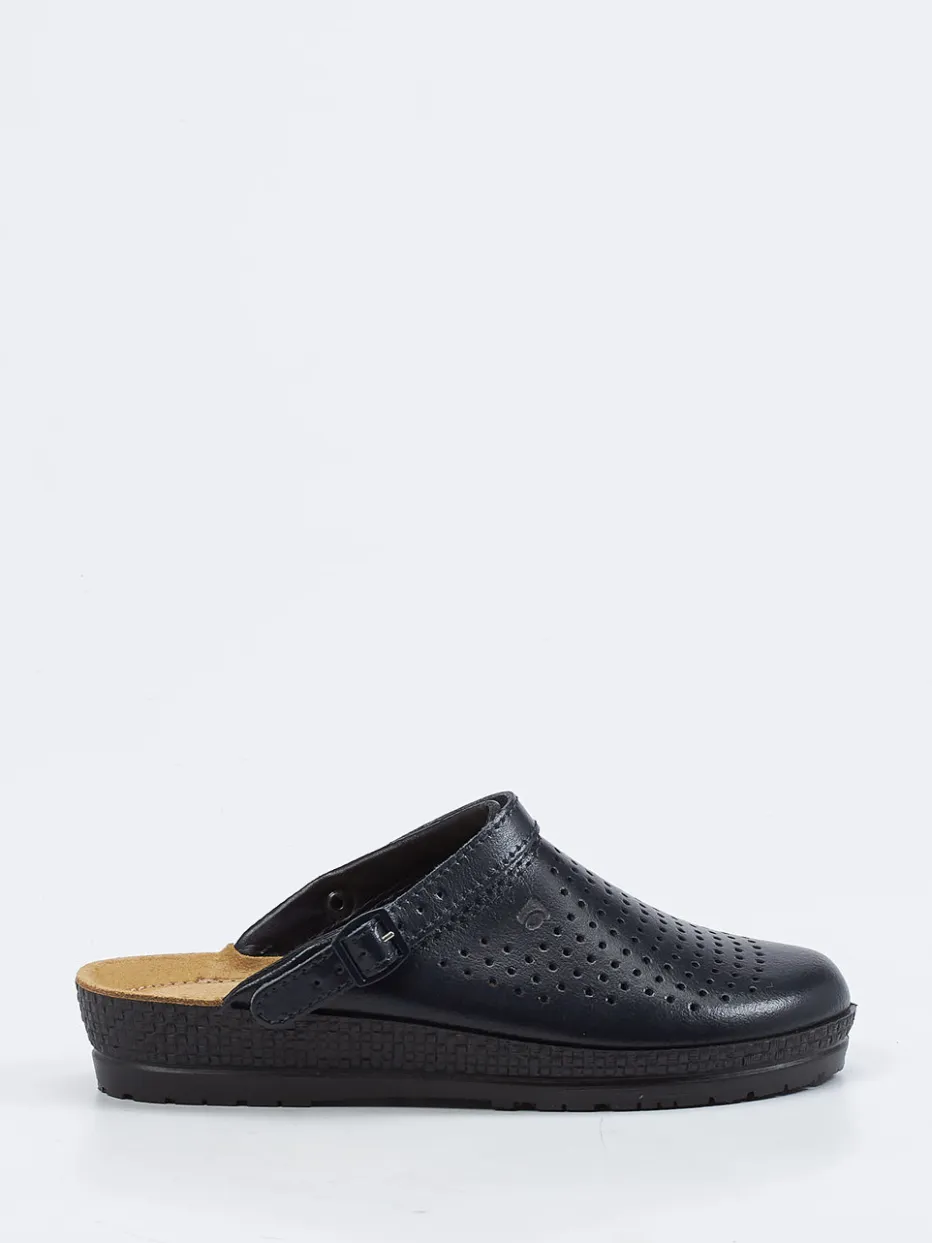 Perfekt für Zuhause oder die Freizeit, überzeugt das Modell durch hochwertiges Kalbleder mit matter Oberfläche und dezenter Perforierung. Der verstellbare Fersenriemen samt Metallschnalle ermöglicht individuelle Anpassung. Ergonomisches Fußbett und eine profilierte PU-Sohle sorgen für Bequemlichkeit bei jedem Schritt. Der Clog präsentiert sich in einem dunklen Blauton mit Ton-in-Ton-Nähten und geschlossener, ergonomischer Form – inspiriert vom Quiet-Luxury-Trend.