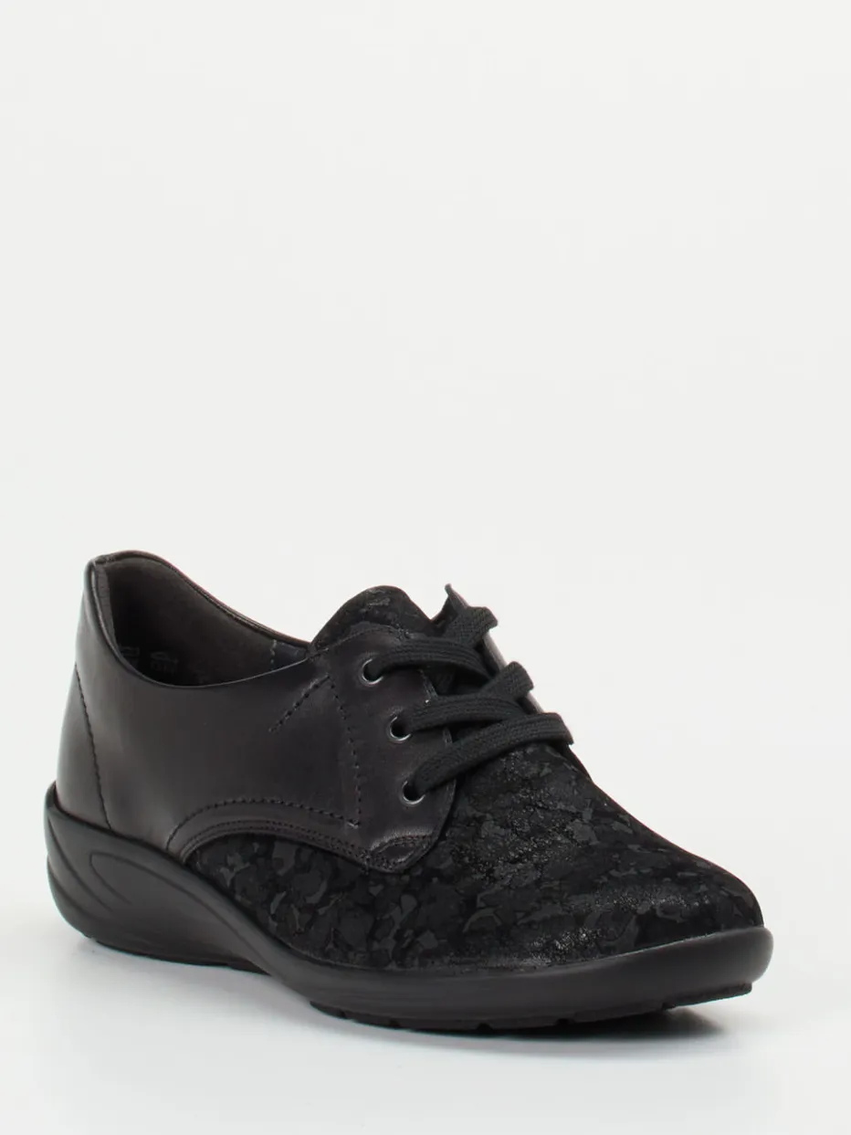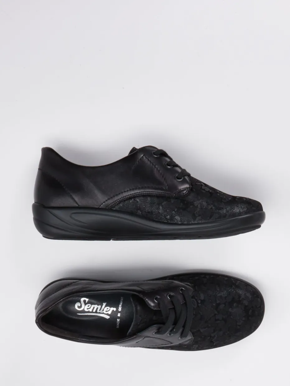 Schwarzer Komfort trifft florales Design.Die Marke Semler präsentiert einen hochwertigen Komfort-Halbschuh für Damen. Ideal für entspannte Spaziergänge oder lange Tage auf den Beinen: Der Schnürschuh verbindet weiches Kalbleder mit strukturiertem Stretchmaterial in floraler Prägung. Das schwarze Design in matter Ton-in-Ton-Optik steht für unaufdringliche Eleganz. Eine ergonomische PU-Komfortlaufsohle, die herausnehmbare Innensohle und Polsterungen erhöhen den Tragekomfort deutlich und bieten Raum für orthopädische Einlegesohlen. Die runde Form und dezente Details fügen sich harmonisch ins Gesamtbild ein. Perfekt kombinierbar zu einer schwarzen Komforthose oder smarten Casual-Looks. Semler Qualität für komfortbetontes Gehen mit stilvollem Understatement.