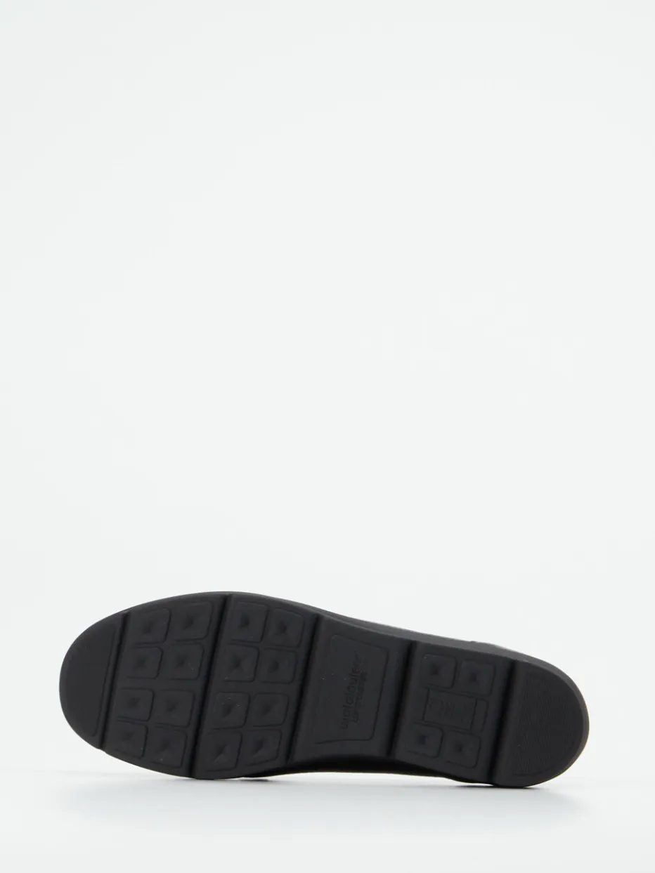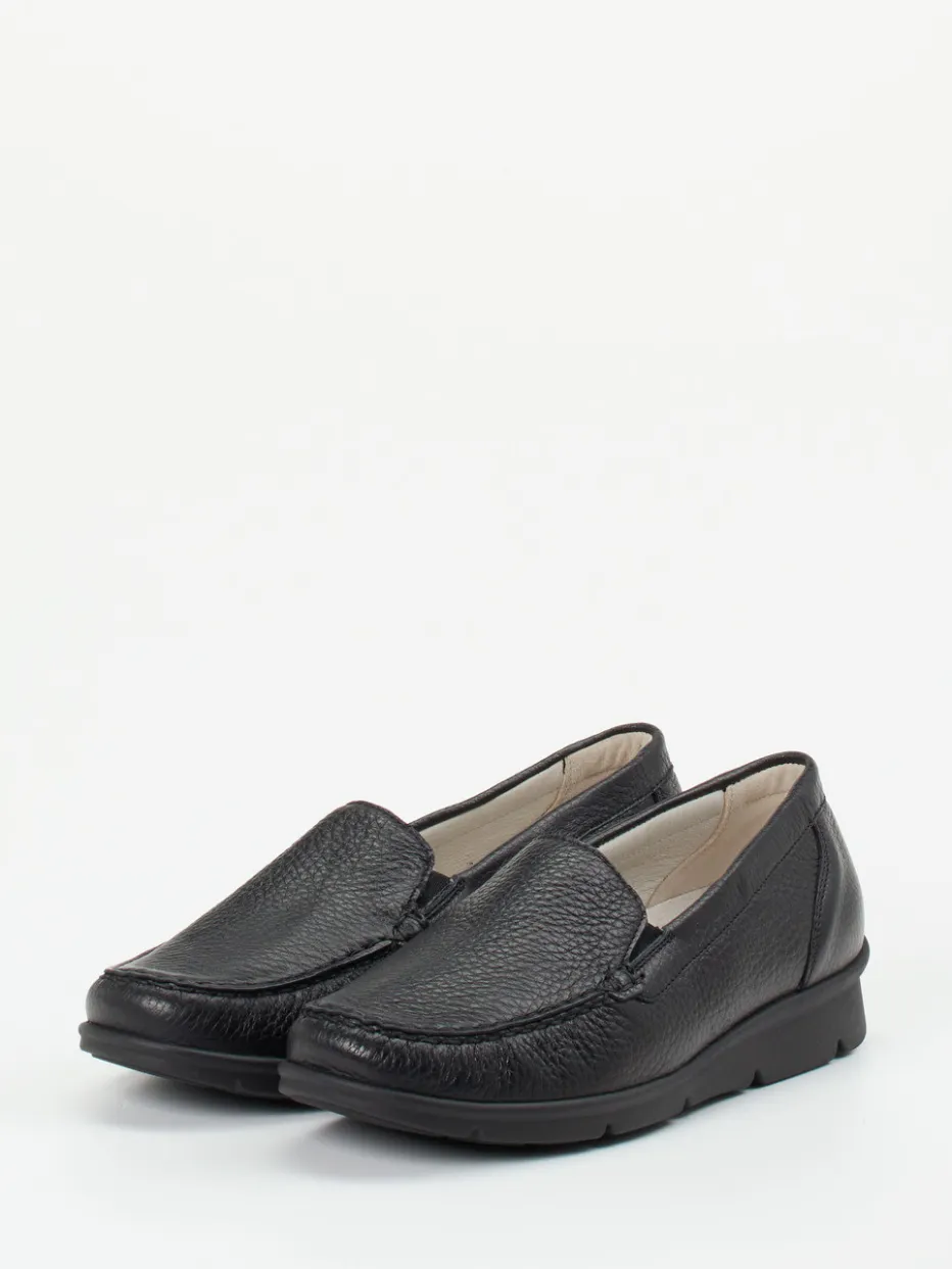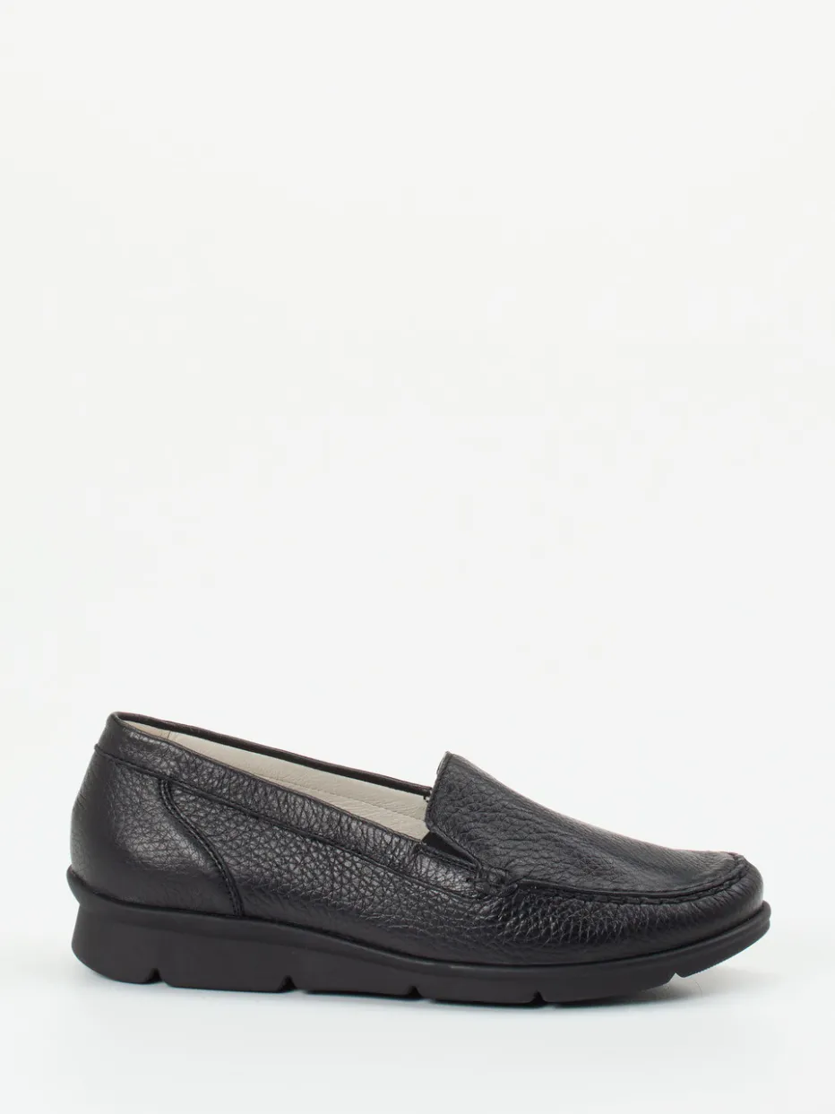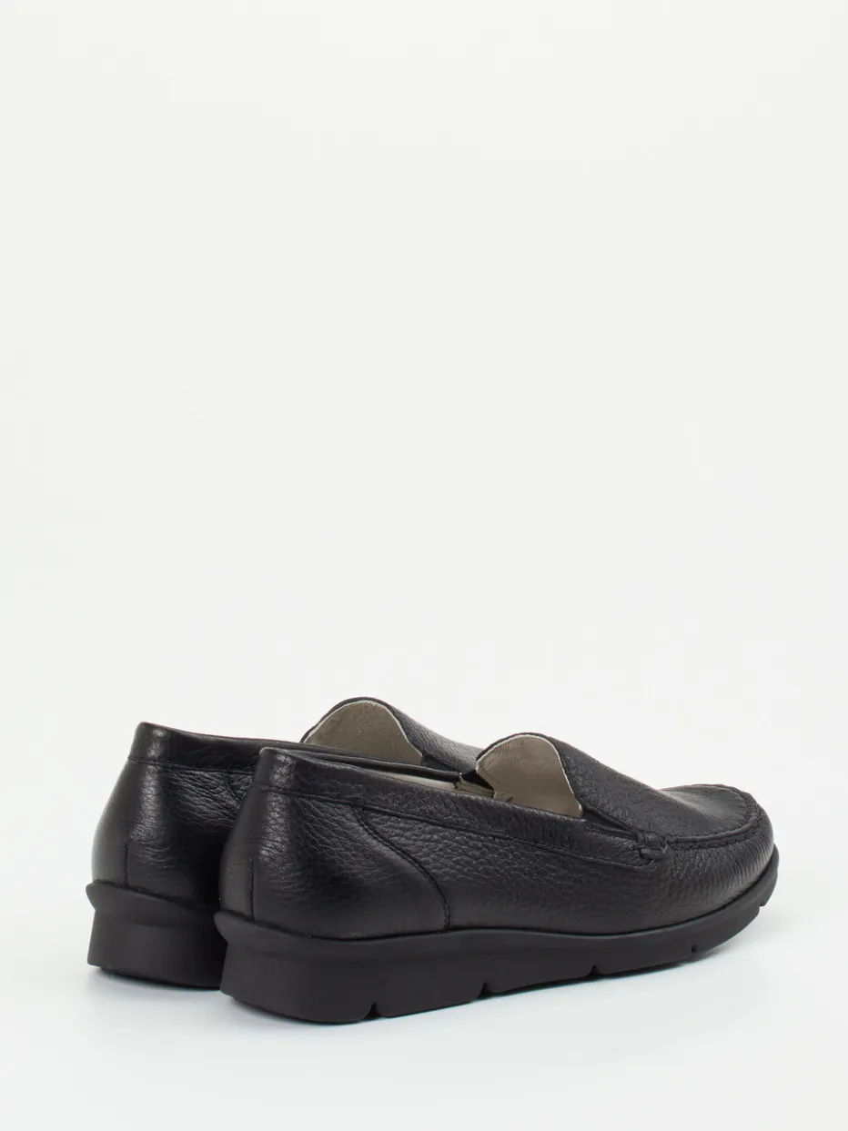 Perfekt bei langen Tagen, bietet das weiche, genarbte Elchleder ein wertiges Tragegefühl und passt sich angenehm dem Fuß an. Die klassische Mokassinnaht unterstreicht die flache, minimalistische Form in dezentem Schwarz. Dank seitlicher Elastikeinsätze wird das An- und Ausziehen erleichtert. Die profilierte Luftpolstersohle wirkt stoßdämpfend und verleiht Stabilität auf jedem Untergrund. Ein herausnehmbares Fußbett bietet Raum für individuelle Einlagen. Die Gestaltung folgt dem Trend ‚Quiet Luxury‘ – unaufdringlich, komfortorientiert, stilvoll kombinierbar.