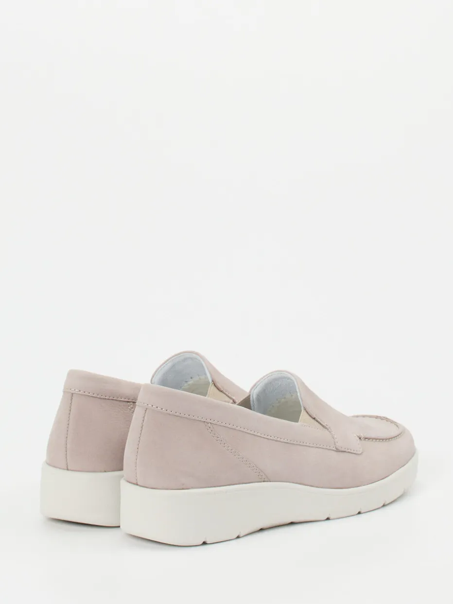 Für lange Tage mit hohem Komfortanspruch bietet das Modell aus hochwertigem Nubukleder, samtig angeschliffen, angenehmen Halt. In zartem Rosé-Beige gehalten, wirkt die klassische, flache Silhouette mit elastischem Einstieg besonders harmonisch. Tonige Ziernähte und eine leicht erhöhte PU-Laufsohle mit sicherem Profil unterstreichen den Alltagstauglichen Charakter. Der weich gepolsterte Komfortinnenraum mit Leder-Textilfutter sowie das wechselbare Fußbett machen ihn auch für Einlagen geeignet. Perfekt zu Relaxwear oder urban-lässigen Kombinationen.