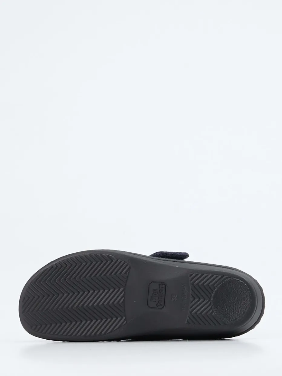 Wohltuender Komfort für entspannte Tage.Finn Comfort präsentiert diesen Damen-Hausschuh als Komfort-Pantoffel für kalte Tage. Die Kombination aus wärmendem Wollfilz und ergonomischem Fußbett erfüllt den Anspruch komfortorientierter Trägerinnen. In sattem Dunkelblau gehalten, betont die filzige Oberfläche die gemütliche Anmutung. Der seitliche Klettverschluss ermöglicht eine exakte Weitenregulierung, während die PU-Sohle mit rutschhemmendem Profil für Trittsicherheit sorgen kann. Dezente Ton-in-Ton-Nähte und ein kleines Metall-Logo akzentuieren das zurückhaltend-moderne Design. Ein Modell im Sinne des Homewear-Revivals – funktional, unaufdringlich und formschön. Ein wohliges Laufgefühl in Finn Comfort Qualität.