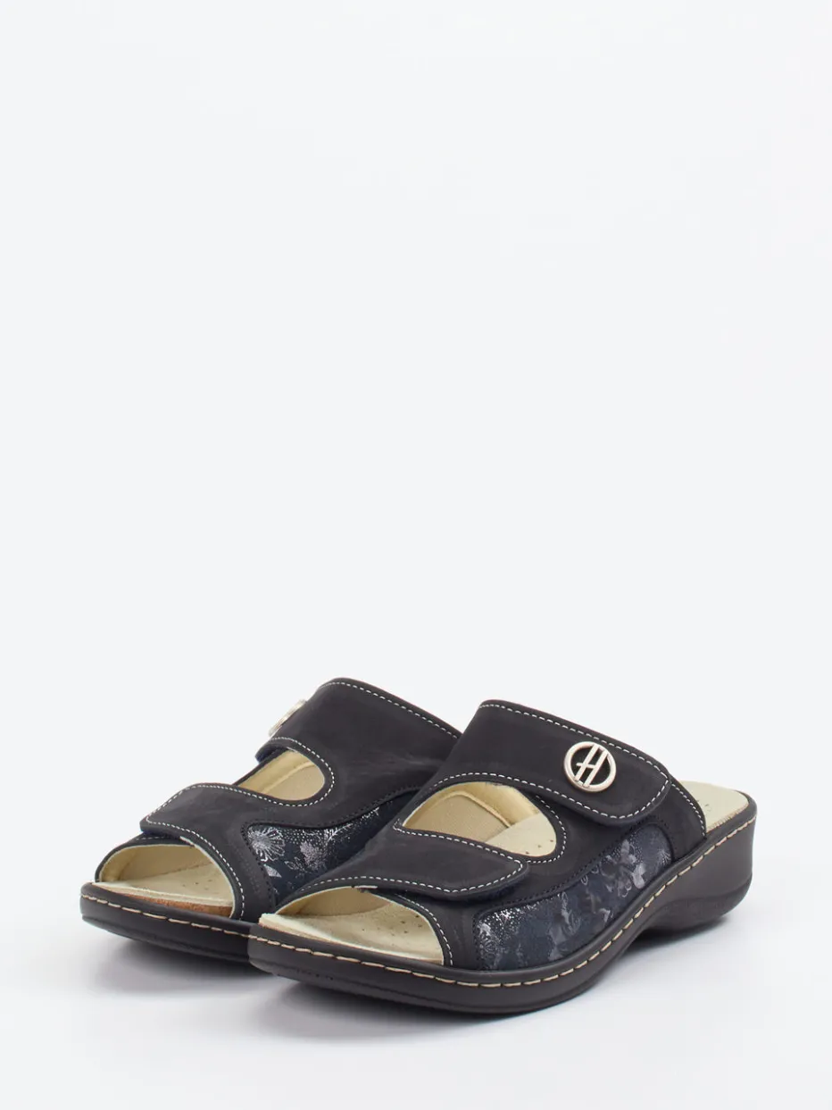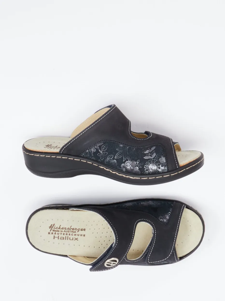 Leichter Sommerkomfort mit funktionalem Anspruch.Hickersberger steht für gesundheitsorientierten Komfort – auch bei dieser Damen-Komfort-Pantolette. Ideal für entspannte Stunden zu Hause oder im Alltag: Das samtig angeschliffene Nubukleder mit Stretchanteil passt sich optimal der Fußform an. Das matte Finish in Anthrazit wird durch florale Prägungen und kontrastierende Ziernähte stilvoll akzentuiert. Zwei verstellbare Klettverschlüsse erlauben individuelle Anpassung, während das weich gepolsterte, lederbezogene Fußbett mit Kräuterextrakten für ein angenehmes Tragegefühl sorgt. Die profilierte PU-Sohle bietet Trittsicherheit und gute Dämpfung. Funktion trifft feminines Design – im typisch bequemen Hickersberger-Stil.