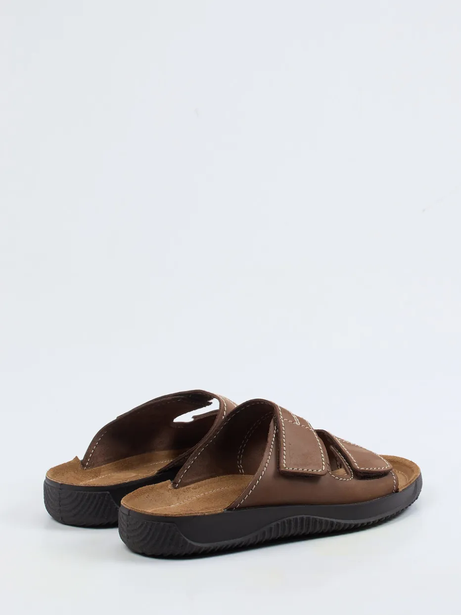 Das braune Nubukleder zeigt sich samtig angeschliffen und unterstreicht den lässig-matten Look. Zwei breite Klettverschlüsse und ein ergonomisch gepolstertes, lederbezogenes Fußbett bieten bequemsten Halt. Kontrastnähte und eine offene Form greifen den aktuellen Comfort-Trend auf, während die rutschhemmende Gummisohle sicheren Stand verspricht. Ideal zur Sweatpants oder Shorts tragbar.