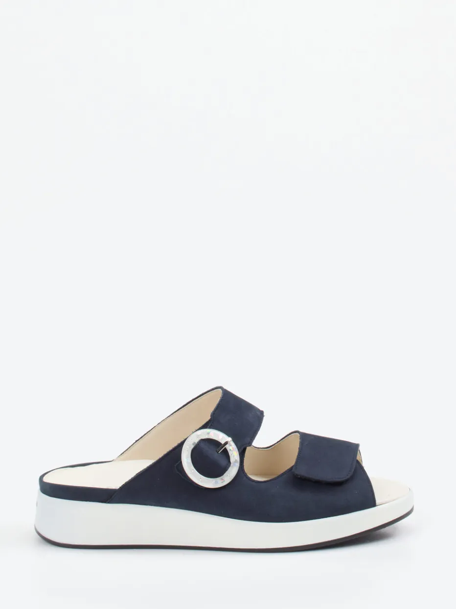 Diese Damen-Komfort-Pantolette von Solidus bietet ausgezeichneten Tragekomfort für Alltag und Freizeit. Das navyblaue Nubukleder liegt dank samtiger Oberfläche weich am Fuß und harmoniert mit der offen ergonomischen Form. Zwei verstellbare Klettverschlüsse sorgen für individuell anpassbaren Sitz, unterstützt durch eine große Rundschnalle in Perlmuttoptik mit silberfarbenen Details. Das austauschbare Luftpolster-Fußbett und die verstärkte Gummisohle gewährleisten gelenkschonendes Gehen und sicheren Halt – auch bei besonderen Fußbedürfnissen. Modisch fügt sich die Sandale in den Trend „Quiet Luxury“. Kombinierbar mit luftiger Stretchhose oder Cardigan für entspannte Sommermomente. Qualität und Komfort vereint im puristischen Solidus-Design.