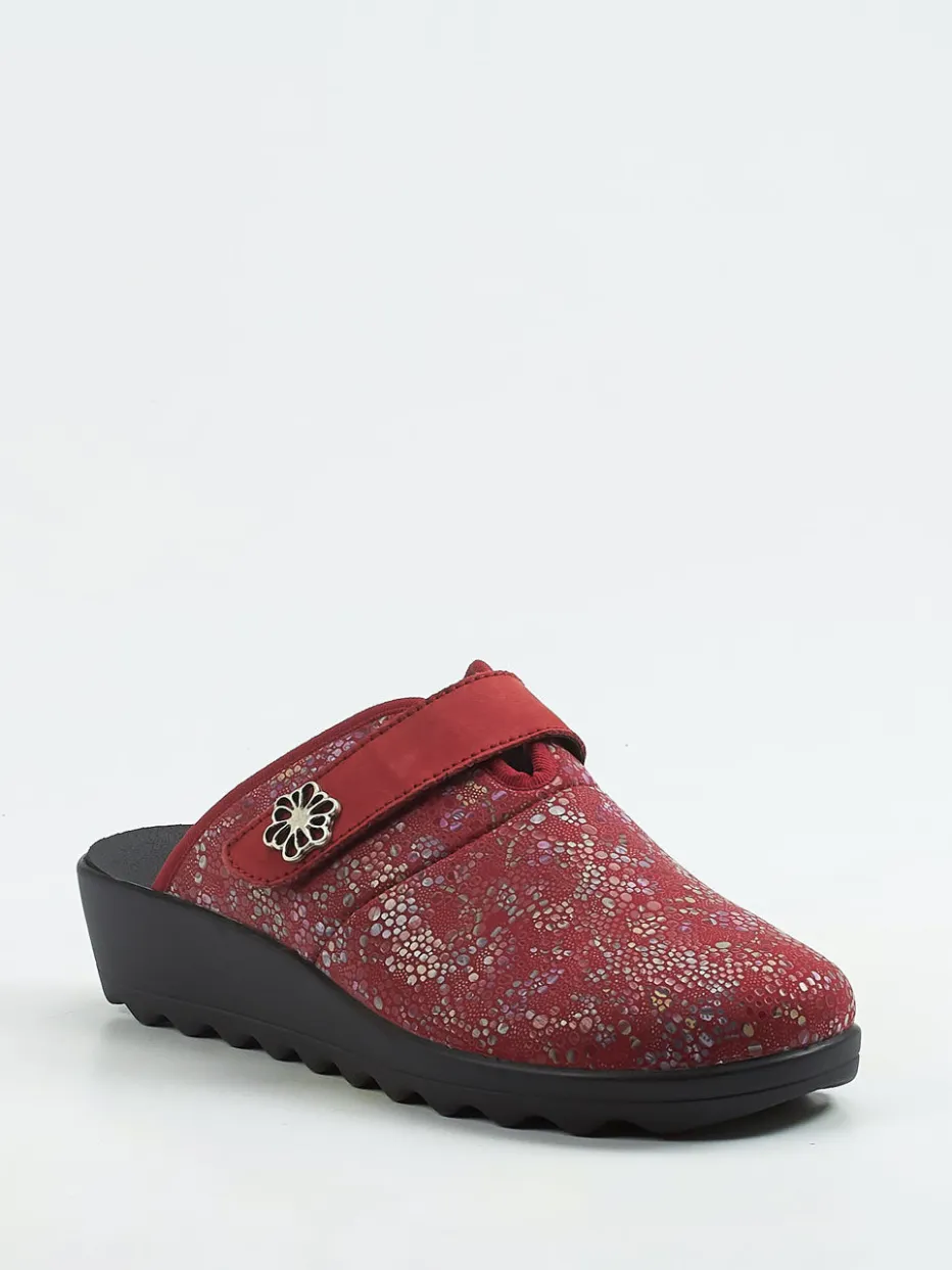 Die weich gepolsterte Damenpantolette mit floraler Textiloberfläche vereint rutschfesten Komfort und liebevolle Detailgestaltung im Stil von Soft Wellness.