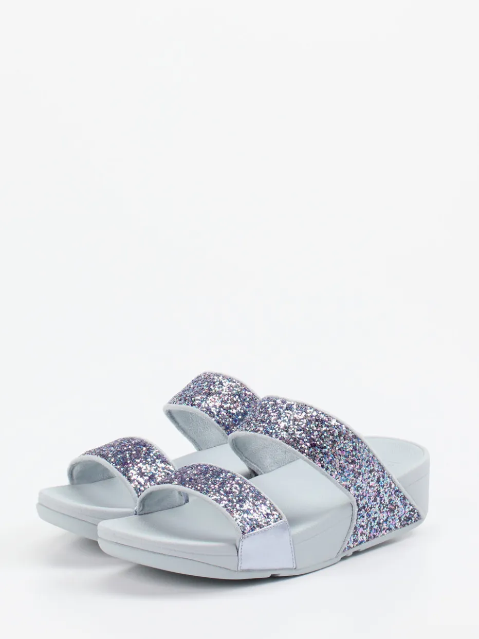Multicolor-Glitter, glänzende Textilriemen und lavendelfarbene Akzente treffen auf eine weich gepolsterte Innensohle. Die ergonomisch geformte Keilsohle aus Gummi sorgt für ausgewogene Druckverteilung und sicheren Halt bei Alltagstouren oder auf Sommerfesten. Die Schlupfform mit zwei breiten Riemen bietet unkomplizierten Einstieg. Im Y2K-Stil gehalten, setzt dieses Modell aktuelle Metallic- und Glitter-Trends um. Kombiniert mit leichten Kleidern oder schimmernden Accessoires entfaltet sich der volle Look.